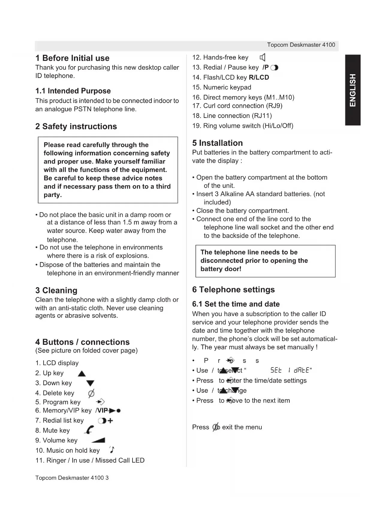 - Press to move to the next item Press to exit the menu Please read carefully through the following information concerning safety and proper use. Make yourself familiar with all the functions of the equipment. Be careful to keep these advice notes and if necessary pass them on to a third party. The telephone line needs to be disconnected prior to opening the battery door!4 Topcom Deskmaster 4100 Topcom Deskmaster 4100