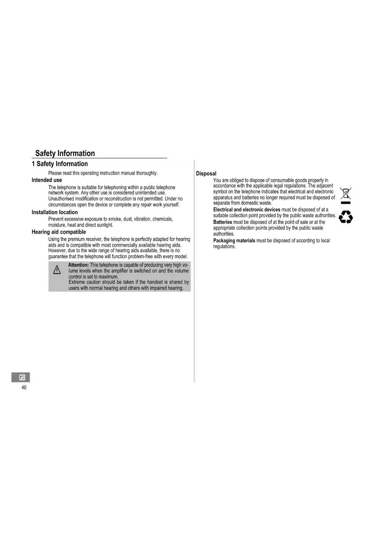 You are obliged to dispose of consumable goods properly in accordance with the applicable legal regulations. The adjacent symbol on the telephone indicates that electrical and electronic apparatus and batteries no longer required must be disposed of separate from domestic waste.