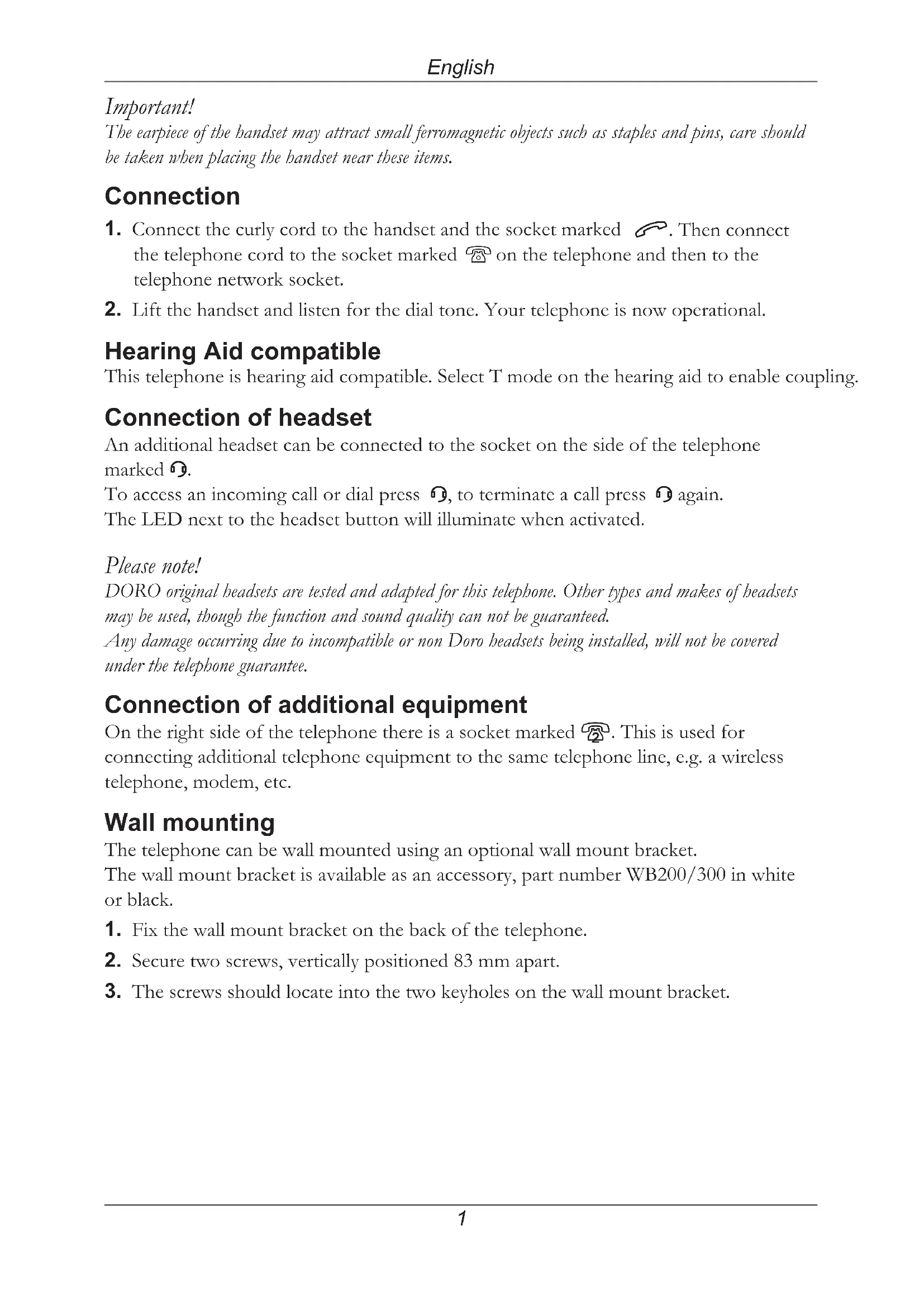 again. The LED next to the headset button will illuminate when activated. Please note! DORO original headsets are tested and adapted for this telephone. Other types and makes of headsets may be used, though the function and sound quality can not be guaranteed. Any damage occurring due to incompatible or non Doro headsets being installed, will not be covered under the telephone guarantee. Connection of additional equipment On the right side of the telephone there is a socket marked 8. This is used for connecting additional telephone equipment to the same telephone line, e.g. a wireless telephone, modem, etc. Wall mounting The telephone can be wall mounted using an optional wall mount bracket. The wall mount bracket is available as an accessory, part number WB200/300 in white or black.