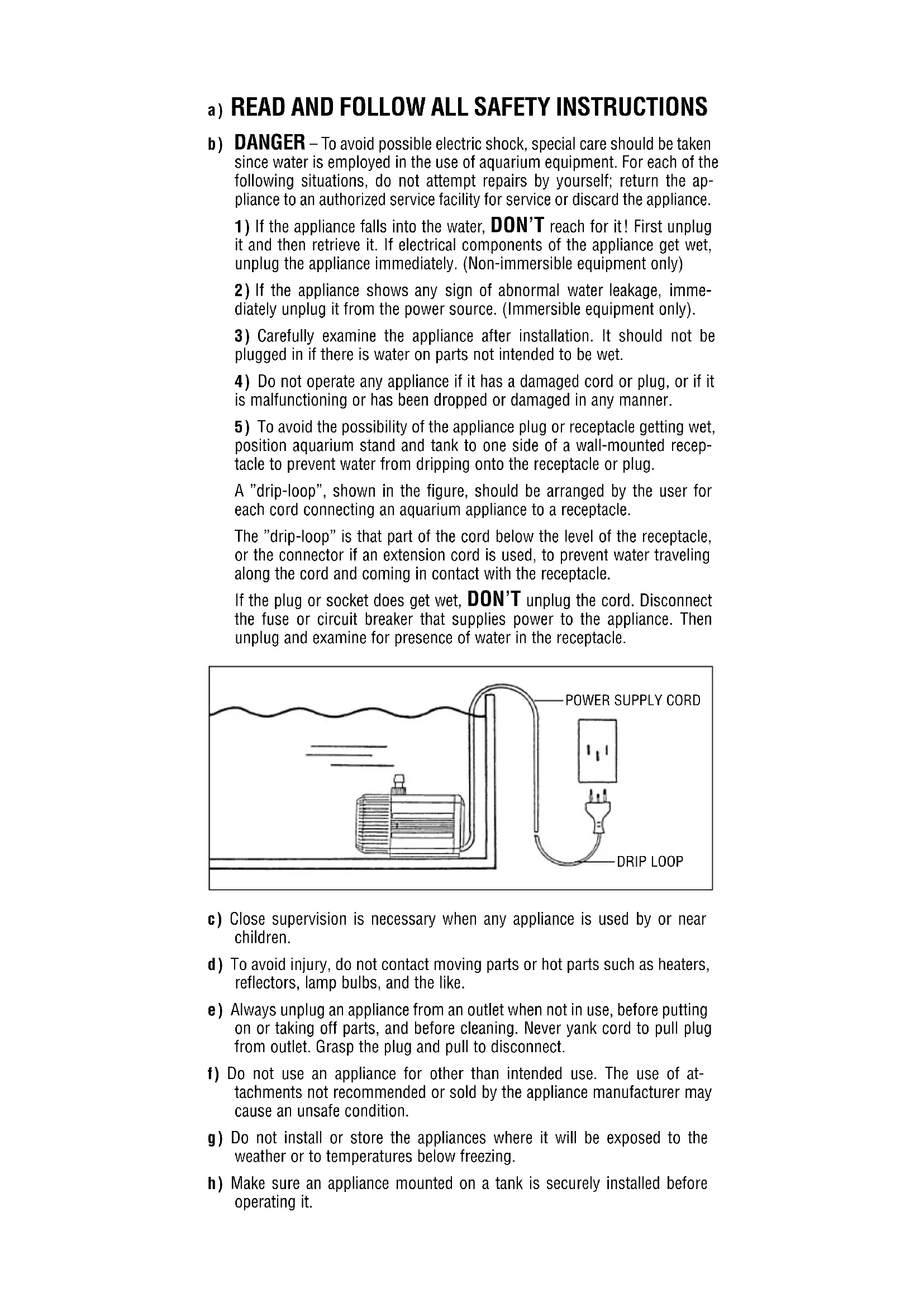 WARNING – To guard against injury, basic safety precautions should be observed, including the following. INSTRUCTIONS 1046 / 3146a) READ AND FOLLOW ALL SAFETY INSTRUCTIONS b) DANGER – To avoid possible electric shock, special care should be taken since water is employed in the use of aquarium equipment. For each of the following situations, do not attempt repairs by yourself; return the ap- pliance to an authorized service facility for service or discard the appliance.