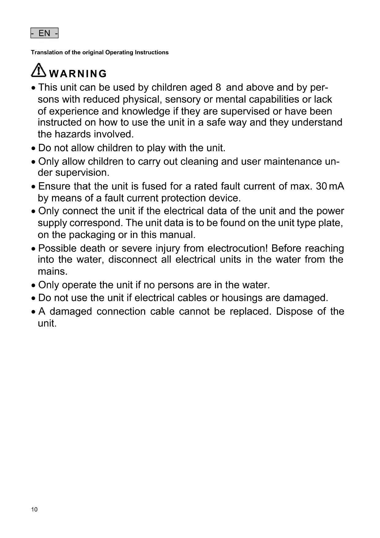 - Possible death or severe injury from electrocution! Before reaching into the water, disconnect all electrical units in the water from the mains.