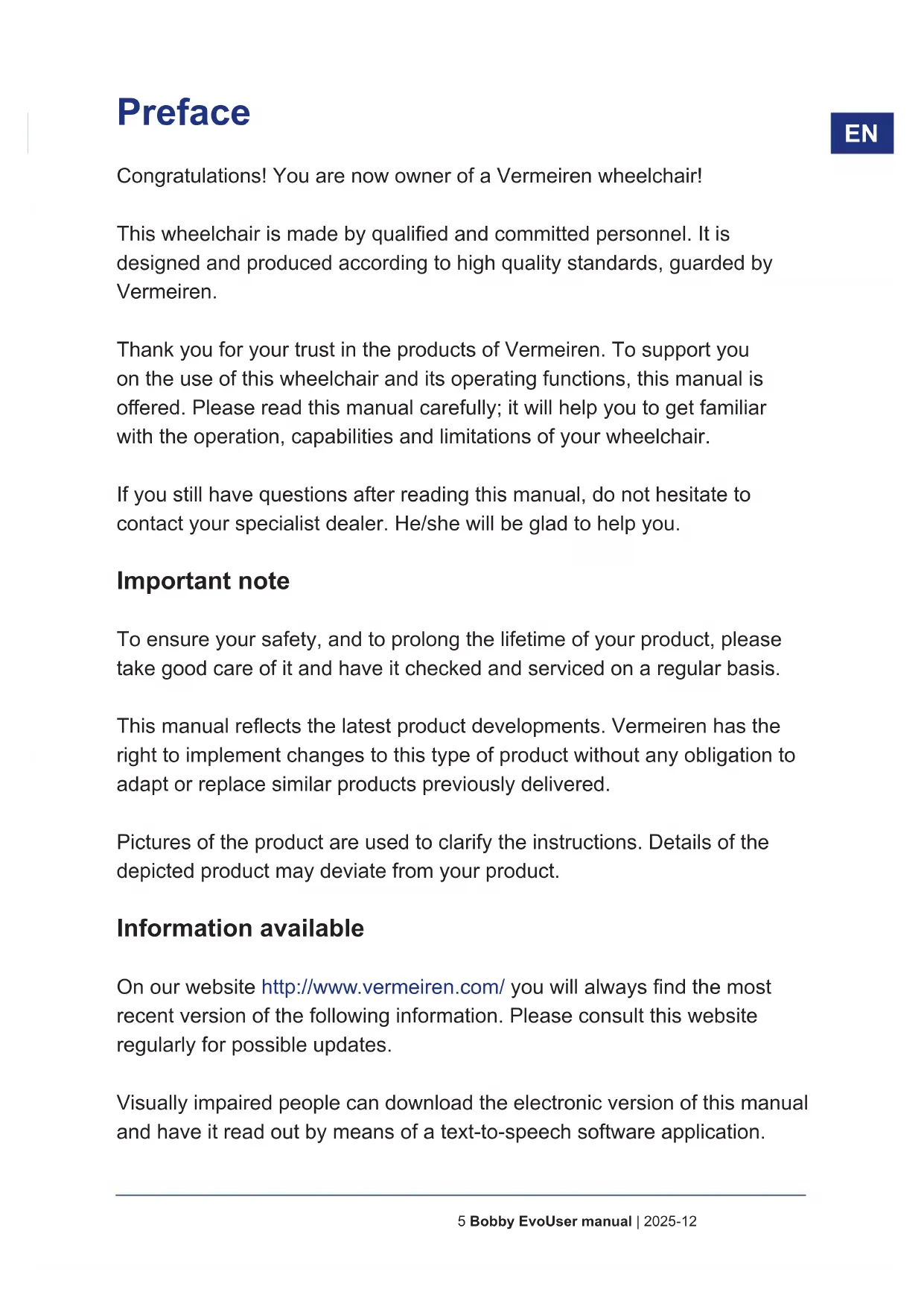 Preface Congratulations! You are now owner of a Vermeiren wheelchair! This wheelchair is made by qualied and committed personnel. It is designed and produced according to high quality standards, guarded by Vermeiren. Thank you for your trust in the products of Vermeiren. To support you on the use of this wheelchair and its operating functions, this manual is oered. Please read this manual carefully; it will help you to get familiar with the operation, capabilities and limitations of your wheelchair. If you still have questions after reading this manual, do not hesitate to contact your specialist dealer. He/she will be glad to help you. Important note To ensure your safety, and to prolong the lifetime of your product, please take good care of it and have it checked and serviced on a regular basis. This manual reects the latest product developments. Vermeiren has the right to implement changes to this type of product without any obligation to adapt or replace similar products previously delivered. Pictures of the product are used to clarify the instructions. Details of the depicted product may deviate from your product. Information available On our website http://www.vermeiren.com/ you will always nd the most recent version of the following information. Please consult this website regularly for possible updates. Visually impaired people can download the electronic version of this manual and have it read out by means of a text-to-speech software application.6User manual | 2025-12 Bobby Evo User manual For user and specialist dealer Service manual for wheelchairs For specialist dealer EC declaration of conformity