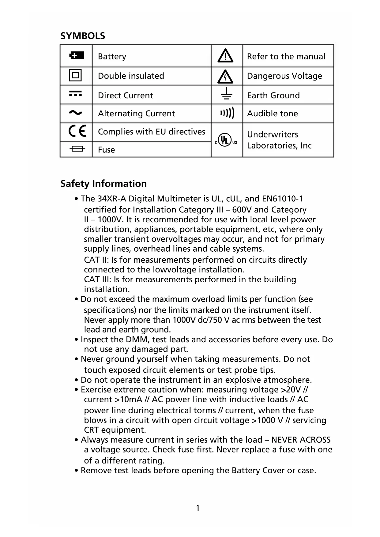 - Gebruiksaanwijzing 34XR-A Professional Digital Multimeter True RMS with Temperature and Backlight34XR-A Professional Digital Multimeter Users Manual 2013, Rev.3 ©2013 Amprobe Test Tools. All rights reserved. Printed in Taiwan EnglishLimited Warranty and Limitation of Liability Your Amprobe product will be free from defects in material and workmanship for one year from the date of purchase unless local laws require otherwise. This warranty does not cover fuses, disposable batteries or damage from accident, neglect, misuse, alteration, contamination, or abnormal conditions of operation or handling. Resellers are not authorized to extend any other warranty on the behalf of Amprobe. To obtain service during the warranty period, return the product with proof of purchase to an authorized Amprobe Service Center or to an Amprobe dealer or distributor. See Repair Section for details. THIS WARRANTY IS YOUR ONLY REMEDY. ALL OTHER WARRANTIES - WHETHER EXPRESS, IMPLIED OR STATUTORY - INCLUDING IMPLIED WARRANTIES OF FITNESS FOR A PARTICULAR PURPOSE OR MERCHANTABILITY, ARE HEREBY DISCLAIMED. MANUFACTURER SHALL NOT BE LIABLE FOR ANY SPECIAL, INDIRECT, INCIDENTAL OR CONSEQUENTIAL DAMAGES OR LOSSES, ARISING FROM ANY CAUSE OR THEORY. Since some states or countries do not allow the exclusion or limitation of an implied warranty or of incidental or consequential damages, this limitation of liability may not apply to you. Repair All test tools returned for warranty or non-warranty repair or for calibration should be accompanied by the following: your name, company’s name, address, telephone number, and proof of purchase. Additionally, please include a brief description of the problem or the service requested and include the test leads with the meter. Non-warranty repair or replacement charges should be remitted in the form of a check, a money order, credit card with expiration date, or a purchase order made payable to Amprobe® Test Tools. In-Warranty Repairs and Replacement – All Countries Please read the warranty statement and check your battery before requesting repair. During the warranty period any defective test tool can be returned to your Amprobe® Test Tools distributor for an exchange for the same or like product. Please check the “Where to Buy” section on www.amprobe.com for a list of distributors near you. Additionally, in the United States and Canada In-Warranty repair and replacement units can also be sent to a Amprobe® Test Tools Service Center (see next page for address). Non-Warranty Repairs and Replacement – US and Canada Non-warranty repairs in the United States and Canada should be sent to a Amprobe® Test Tools Service Center. Call Amprobe® Test Tools or inquire at your point of purchase for current repair and replacement rates. In USA In Canada Amprobe Test Tools Amprobe Test Tools Everett, WA 98203 Mississauga, ON L4Z 1X9 Tel: 888-993-5853 Tel: 905-890-7600 Fax: 425-446-6390 Fax: 905-890-6866 Non-Warranty Repairs and Replacement – Europe European non-warranty units can be replaced by your Amprobe® Test Tools distributor for a nominal charge. Please check the “Where to Buy” section on www. amprobe.com for a list of distributors near you. Amprobe® Test Tools Europe In den Engematten 14 79286 Glottertal, Germany tel: +49 (0) 7684 8009 - 0 *(Correspondence only – no repair or replacement available from this address. European customers please contact your distributor.)customers please contact your distributor.)34XR-A Digital MultimeterCONTENTS SAFETY INFORMATION .......................................................1 INTRODUCTION ....................................................................2 MAKING MEASUREMENTS .................................................2 Verify Instrument Operation ........................................................ 2 Range Selection ............................................................................. 2 Correcting an Overload (OL) Indication ....................................... 2 Measuring DC Voltage .......................See Figure -1- ................... 2 Measuring AC Voltage (True rms) See Figures -2- & -3- .............. 3 Preparing for Current Measurements ........................................... 3 Measuring DC Current .......................See Figure -4- . .................. 3 Measuring AC Current (True rms) See Figures -3- & -5- ............... 3 Measuring Resistance .........................See Figure -6- ................... 4 Measuring Continuity .........................See Figure -7- ................... 4 Checking Diodes .................................See Figure -8- . .................. 4 Measuring Capacitance ......................See Figure -9- ................... 4 Measuring Temperature ....................See Figure -10- ................. 4 Measuring Frequency .........................See Figure -11- ................. 5 Measuring Dutycycle ..........................See Figure -12- ................. 5 ADDITIONAL FEATURES ......................................................5 Input Test Lead Warning ............................................................... 5 True-rms Measurements ................................................................ 5 MIN MAX Measurements .............................................................. 5 Auto Power Off ............................................................................. 6 HOLD Measurements .................................................................... 6 Backlight ........................................................................................ 6 PRODUCT MAINTENANCE ...................................................6 Battery and Fuse Replacement ...........See Figure -13- ................. 7 SPECIFICATIONS ...................................................................71 SYMBOLS