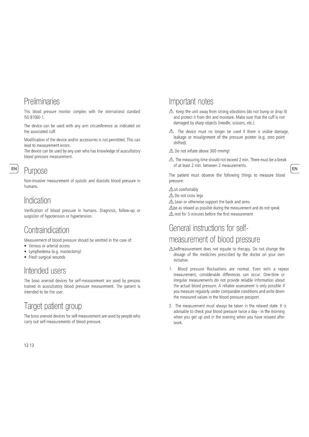 - Fresh surgical wounds Intended users The boso aneroid devices for self-measurement are used by persons trained in auscultatory blood pressure measurement. The patient is intended to be the user. Target patient group The boso aneroid devices for self-measurement are used by people who carry out self-measurements of blood pressure. Important notes Keep the unit away from strong vibrations (do not bump or drop it) and protect it from dirt and moisture. Make sure that the cuff is not damaged by sharp objects (needle, scissors, etc.). The device must no longer be used if there is visible damage, leakage or misalignment of the pressure pointer (e.g. zero point shifted). Do not inflate above 300 mmHg! The measuring time should not exceed 2 min. There must be a break of at least 2 min. between 2 measurements. The patient must observe the following things to measure blood pressure: sit comfortably Do not cross legs Lean or otherwise support the back and arms be as relaxed as possible during the measurement and do not speak rest for 5 minutes before the first measurement General instructions for self- measurement of blood pressure Selfmeasurement does not equate to therapy. Do not change the dosage of the medicines prescribed by the doctor on your own initiative.