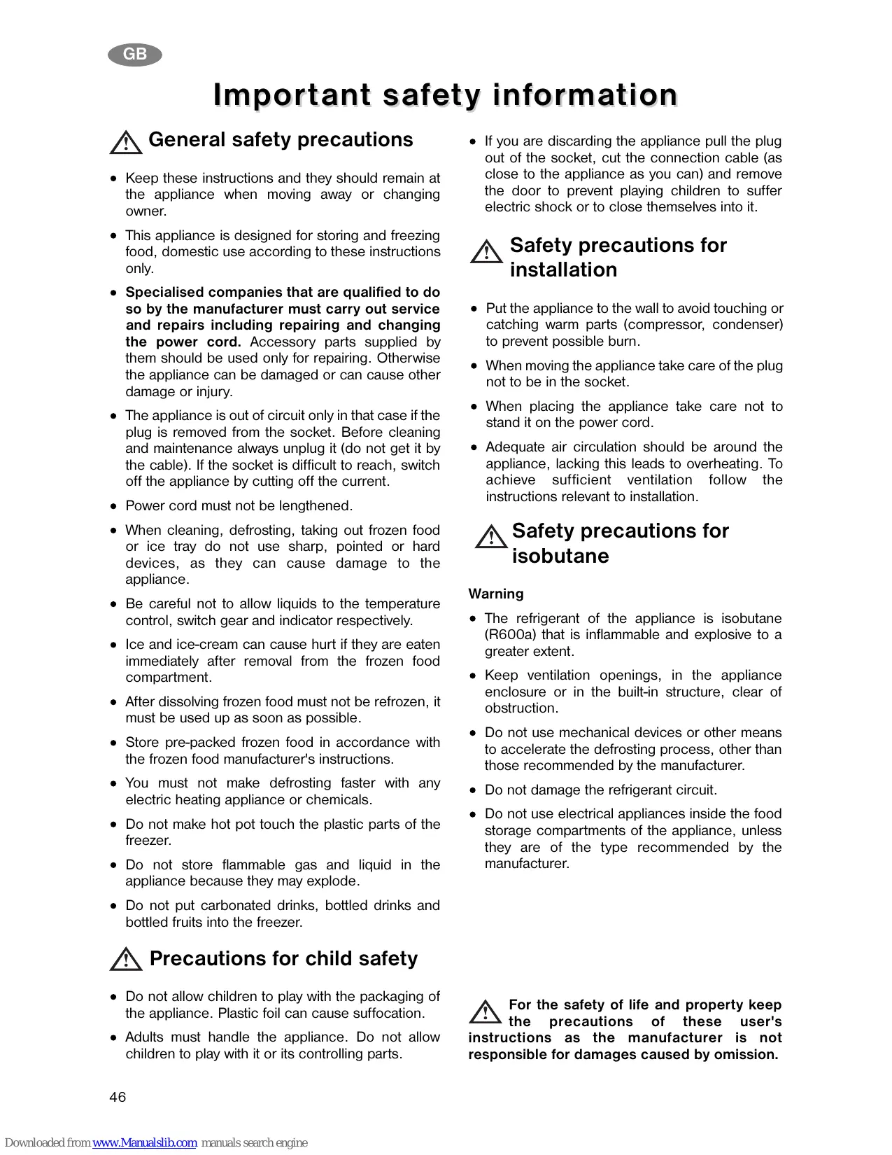 Im por t ant saf e t y inf or mation General safety precautions Keep these instructions and they should remain at the appliance when moving away or changing owner. This appliance is designed for storing and freezing food, domestic use according to these instructions only. Specialised companies that are qualified to do so by the manufacturer must carry out service and repairs including repairing and changing the power cord. Accessory parts supplied by them should be used only for repairing. Otherwise the appliance can be damaged or can cause other damage or injury. The appliance is out of circuit only in that case if the plug is removed from the socket. Before cleaning and maintenance always unplug it (do not get it by the cable). If the socket is difficult to reach, switch off the appliance by cutting off the current. Power cord must not be lengthened. When cleaning, defrosting, taking out frozen food or ice tray do not use sharp, pointed or hard devices, as they can cause damage to the appliance. Be careful not to allow liquids to the temperature control, switch gear and indicator respectively. Ice and ice-cream can cause hurt if they are eaten immediately after removal from the frozen food compartment. After dissolving frozen food must not be refrozen, it must be used up as soon as possible. Store pre-packed frozen food in accordance with the frozen food manufacturer's instructions. You must not make defrosting faster with any electric heating appliance or chemicals. Do not make hot pot touch the plastic parts of the freezer. Do not store flammable gas and liquid in the appliance because they may explode. If you are discarding the appliance pull the plug out of the socket, cut the connection cable (as close to the appliance as you can) and remove the door to prevent playing children to suffer electric shock or to close themselves into it. Safety precautions for installation Put the appliance to the wall to avoid touching or catching warm parts (compressor, condenser) to prevent possible burn. When moving the appliance take care of the plug not to be in the socket. When placing the appliance take care not to stand it on the power cord. Adequate air circulation should be around the appliance, lacking this leads to overheating. To achieve sufficient ventilation follow the instructions relevant to installation. Safety precautions for isobutane Warning The refrigerant of the appliance is isobutane (R600a) that is inflammable and explosive to a greater extent. Keep ventilation openings, in the appliance enclosure or in the built-in structure, clear of obstruction. Do not use mechanical devices or other means to accelerate the defrosting process, other than those recommended by the manufacturer. Do not damage the refrigerant circuit. Do not use electrical appliances inside the food storage compartments of the appliance, unless they are of the type recommended by the manufacturer. Do not put carbonated drinks, bottled drinks and bottled fruits into the freezer. Precautions for child safety Do not allow children to play with the packaging of the appliance. Plastic foil can cause suffocation. Adults must handle the appliance. Do not allow children to play with it or its controlling parts. Downloaded from www.Manualslib.com manuals search engine For the safety of life and property keep the precautions of these user's instructions as the manufacturer is not responsible for damages caused by omission.
