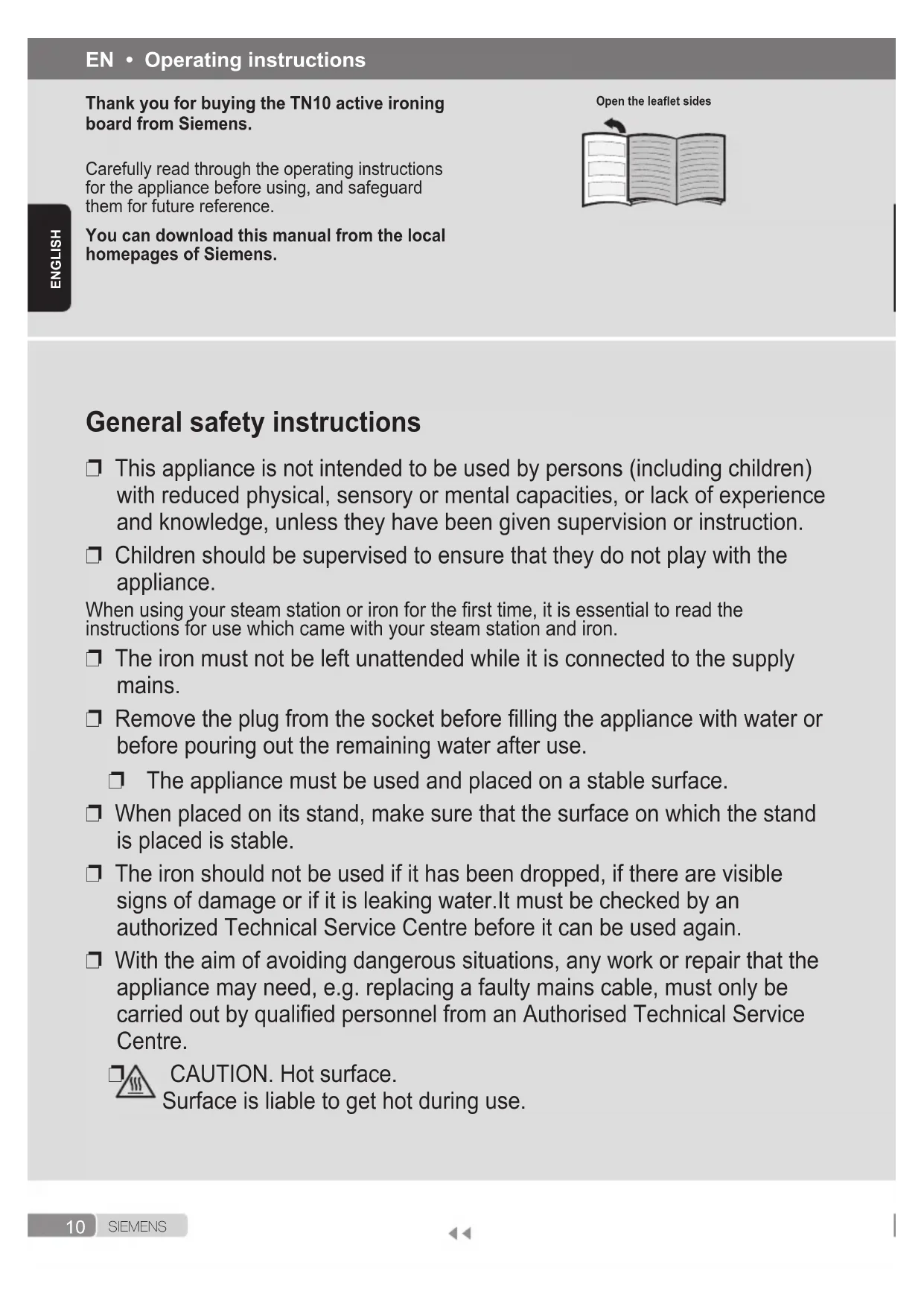 CAUTION. Hot surface. Surface is liable to get hot during use. Thank you for buying the TN10 active ironing board from Siemens. Carefully read through the operating instructions for the appliance before using, and safeguard them for future reference. You can download this manual from the local homepages of Siemens. EN • Operating instructions11 S I E M E N S ENglISH Important notices