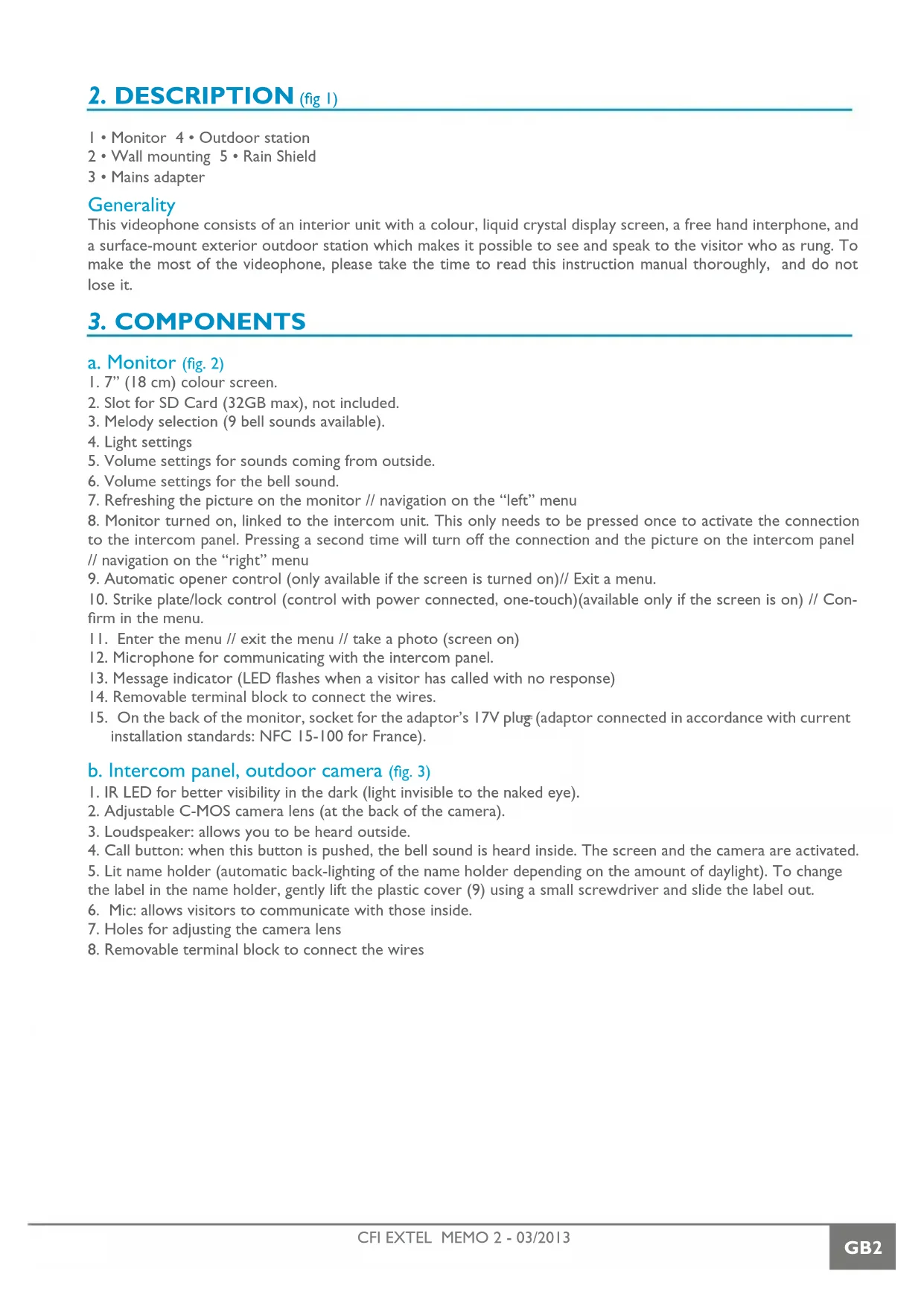 The damages caused by the non-compliance to the manual lead to the expiration of the warranty. We will not assume any responsibility for the resulting damage! We will not assume any responsibility concerning any damage, to the goods or people, caused by improper handling or by non compliance with the safety instructions. This product has been manufactured in compliance with safety instructions. In order to keep this status and ensuring the best operation of the product, the user must respect the safety instructions and warnings contained in this manual. : This symbol indicates a risk of electric shock or a risk of short circuit - You should only use this product within a voltage range between: 100-240 Volts and 50-60 hertz. Never intend to use this product with a different voltage. - Make sure all electrical connections of the system are compliant with instructions of use. - In commercial establishments, make sure to respect the rules for preventing accidents with the electrical installations. - In schools, training institutions and workshops… the presence of a qualified personnel is necessary to control the operation of electronic appliances. - Respect the instructions of use of other appliances connected to the system. (video recorder, TV, PC for example) - Please contact an experienced person in case of doubt concerning the mode of operation or the safety of the appliances. - Never connect or disconnect the electrical appliances with wet hands. - When installing this product, check the power supply cables are not liable to be damaged. - Never replace the damaged electrical cables by yourself! In this case, remove them and contact an experienced person. WARNING Informs the user about the presence of important instructions concerning the use and the maintenance (repair) in the documentation supplied with the appliance. Informs the user about the presence of “hazardous voltages” non-isolated inside the housing of the product, being sufficiently high to represent a risk of electrocution for people.CFI EXTEL MEMO 2 - 03/2013 NL1 INHOUD 1 VEILIGHEIDSINSTRUCTIES. ...................................... p.1 2 BESCHRIJVING ............................................................... p.2 3 ONDERDELEN ................................................................ p.2 a. Monitor b. Intercom aan de straatkant, met buitencamera