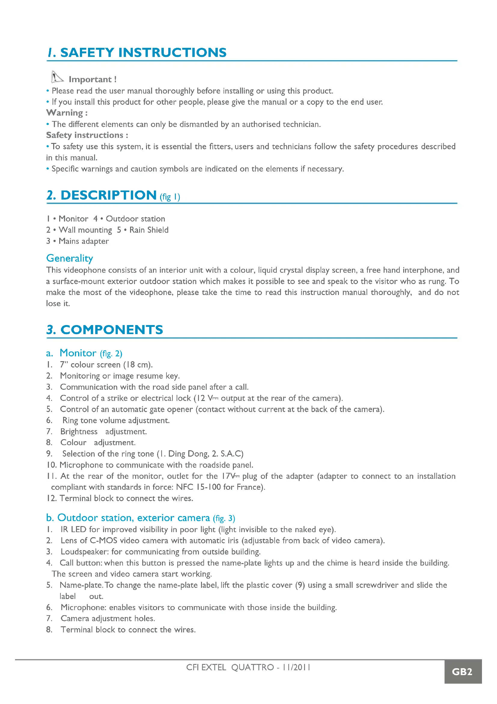 The damages caused by the non-compliance to the manual lead to the expiration of the warranty. We will not assume any responsibility for the resulting damage! We will not assume any responsibility concerning any damage, to the goods or people, caused by improper handling or by non compliance with the safety instructions. This product has been manufactured in compliance with safety instructions. In order to keep this status and ensuring the best operation of the product, the user must respect the safety instructions and warnings contained in this manual. The user of this system is responsible for checking whether the video surveillance is compliant with the law in force in the country of use. : This symbol indicates a risk of electric shock or a risk of short circuit - You should only use this product within a voltage range between: 100-240 Volts and 50-60 hertz. Never intend to use this product with a different voltage. - Make sure all electrical connections of the system are compliant with instructions of use. - In commercial establishments, make sure to respect the rules for preventing accidents with the electrical installations. - In schools, training institutions and workshops… the presence of a qualified personnel is necessary to control the operation of electronic appliances. - Respect the instructions of use of other appliances connected to the system. (video recorder, TV, PC for example) - Please contact an experienced person in case of doubt concerning the mode of operation or the safety of the appliances. - Never connect or disconnect the electrical appliances with wet hands. - When installing this product, check the power supply cables are not liable to be damaged. - Never replace the damaged electrical cables by yourself! In this case, remove them and contact an experienced person. WARNING Informs the user about the presence of important instructions concerning the use and the maintenance (repair) in the documentation supplied with the appliance. Informs the user about the presence of “hazardous voltages” non-isolated inside the housing of the product, being sufficiently high to represent a risk of electrocution for people.CFI EXTEL QUATTRO - 11/2011 NL1 INHOUD 1 VEILIGHEIDSINSTRUCTIES. .................................................p.2 2 BESCHRIJVING. ................................................................................p.2 3 ONDERDELEN .................................................................................p.2 a. Monitor b. Intercom aan de straatkant, met buitencamera