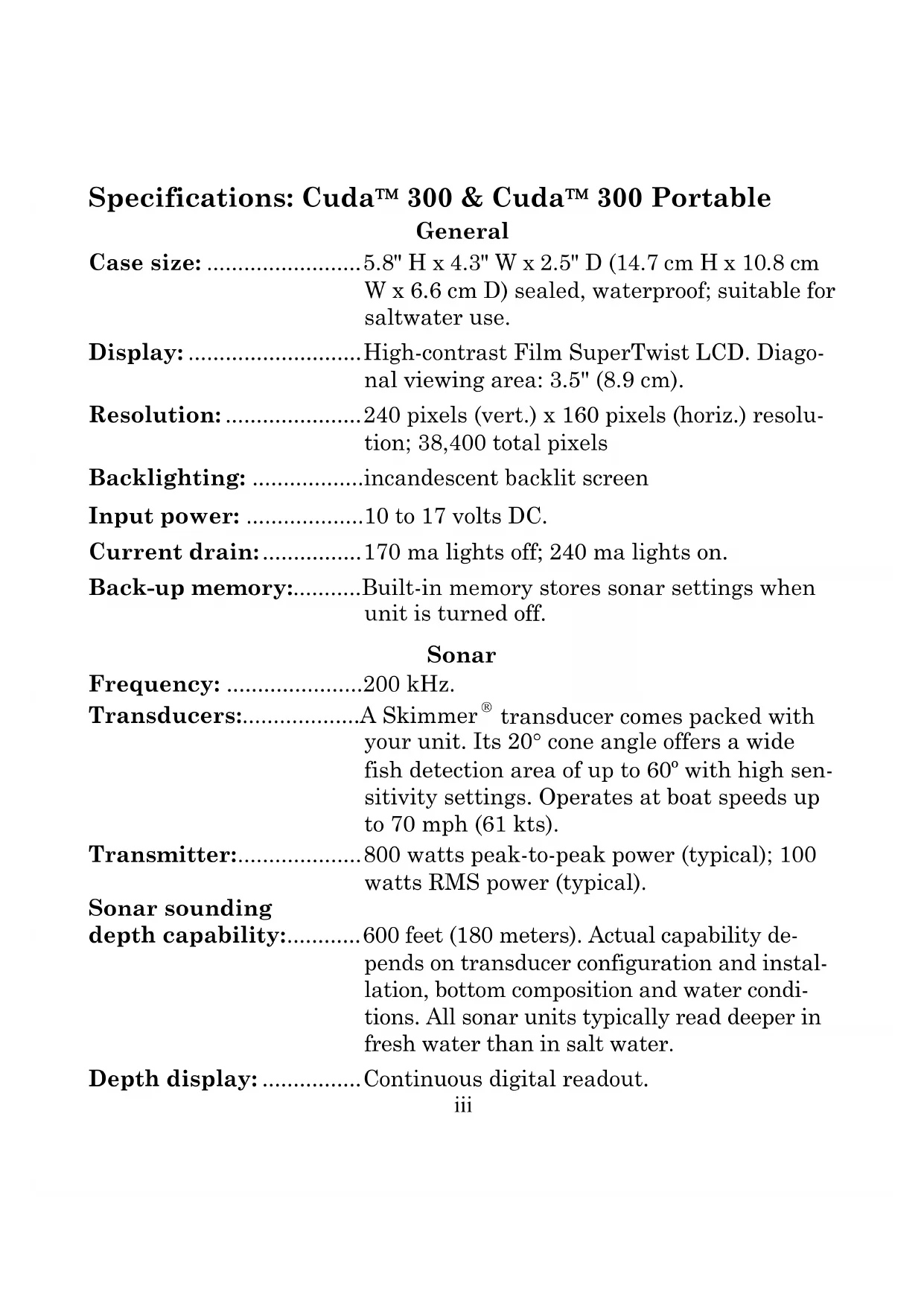 transducer comes packed with your unit. Its 20° cone angle offers a wide fish detection area of up to 60º with high sen- sitivity settings. Operates at boat speeds up to 70 mph (61 kts). Transmitter:....................800 watts peak-to-peak power (typical); 100 watts RMS power (typical). Sonar sounding depth capability:............600 feet (180 meters). Actual capability de- pends on transducer configuration and instal- lation, bottom composition and water condi- tions. All sonar units typically read deeper in fresh water than in salt water. Depth display: ................Continuous digital readout.iv Audible alarms:..............Deep/shallow/fish. Automatic ranging: .......Yes, with instant screen updates. Auto bottom track: ........Yes. Zoom bottom track:.......Yes. Split-screen zoom: .........No. Surface water temp: .....Yes, built into transducer. Optional external temperature sensor or combo speed/temp sensor available. NOTICE! The storage temperature for your unit is from -4 degrees to +167 degrees Fahrenheit (-20 degrees to +75 degrees Celsius). Extended storage in temperatures higher or lower than specified will damage the liquid crystal display in your unit. This type of damage is not covered by the warranty. For more information, contact the fac- tory's Customer Service Department; phone numbers are inside the manual's back cover.1 Transducer Installation Preparations You can install the sonar in some other order if you prefer, but we rec- ommend this installation sequence: Caution: You should read over this entire installation section before drill- ing any holes in your vehicle or vessel!