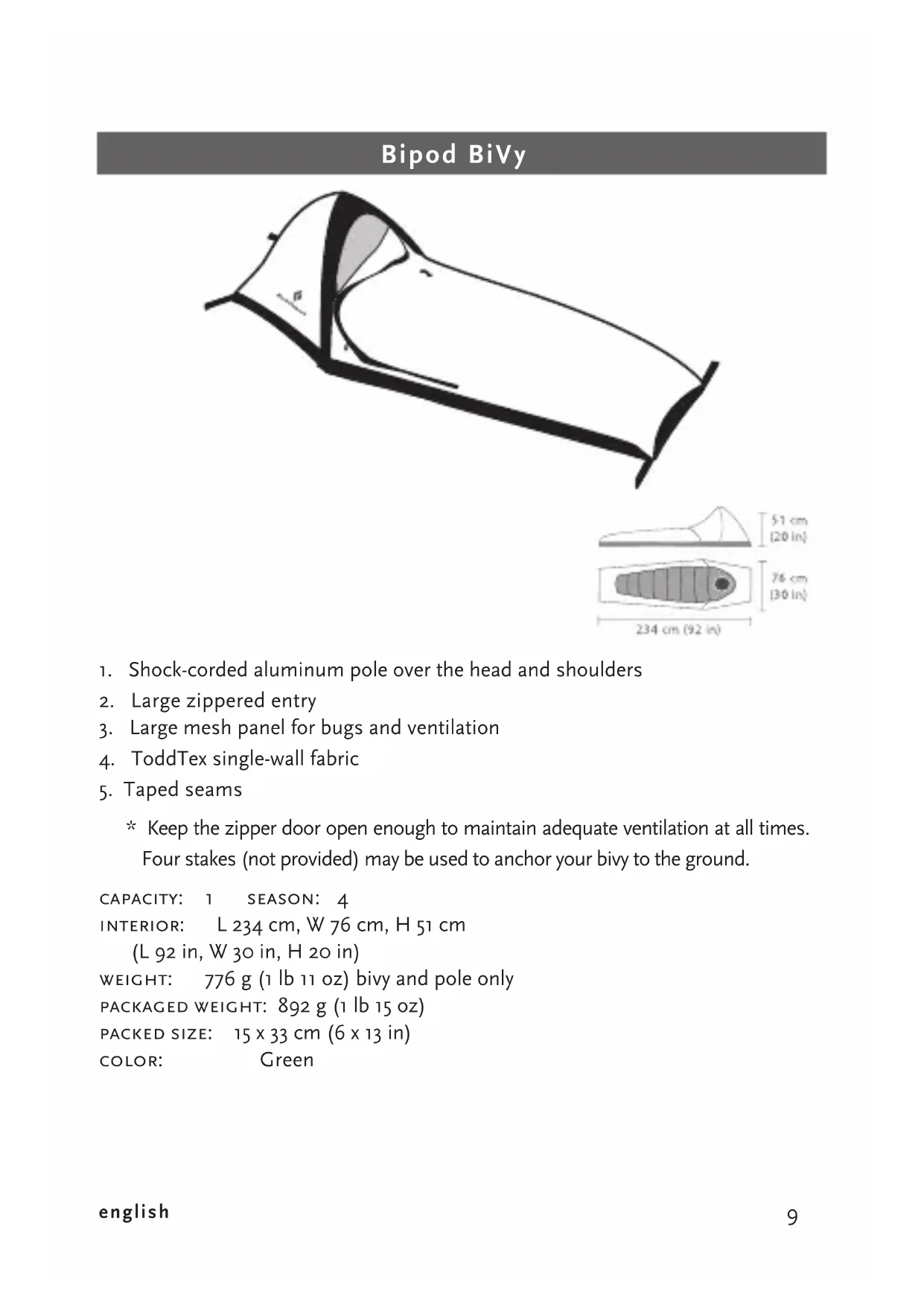 - Keep the zipper door open enough to maintain adequate ventilation at all times. Four stakes (not provided) may be used to anchor your bivy to the ground. : 1 : 4 : L 234 cm, W 76 cm, H 51 cm (L 92 in, W 30 in, H 20 in) : 776 g (1 lb 11 oz) bivy and pole only : 892 g (1 lb 15 oz) : 15 x 33 cm (6 x 13 in) : Green