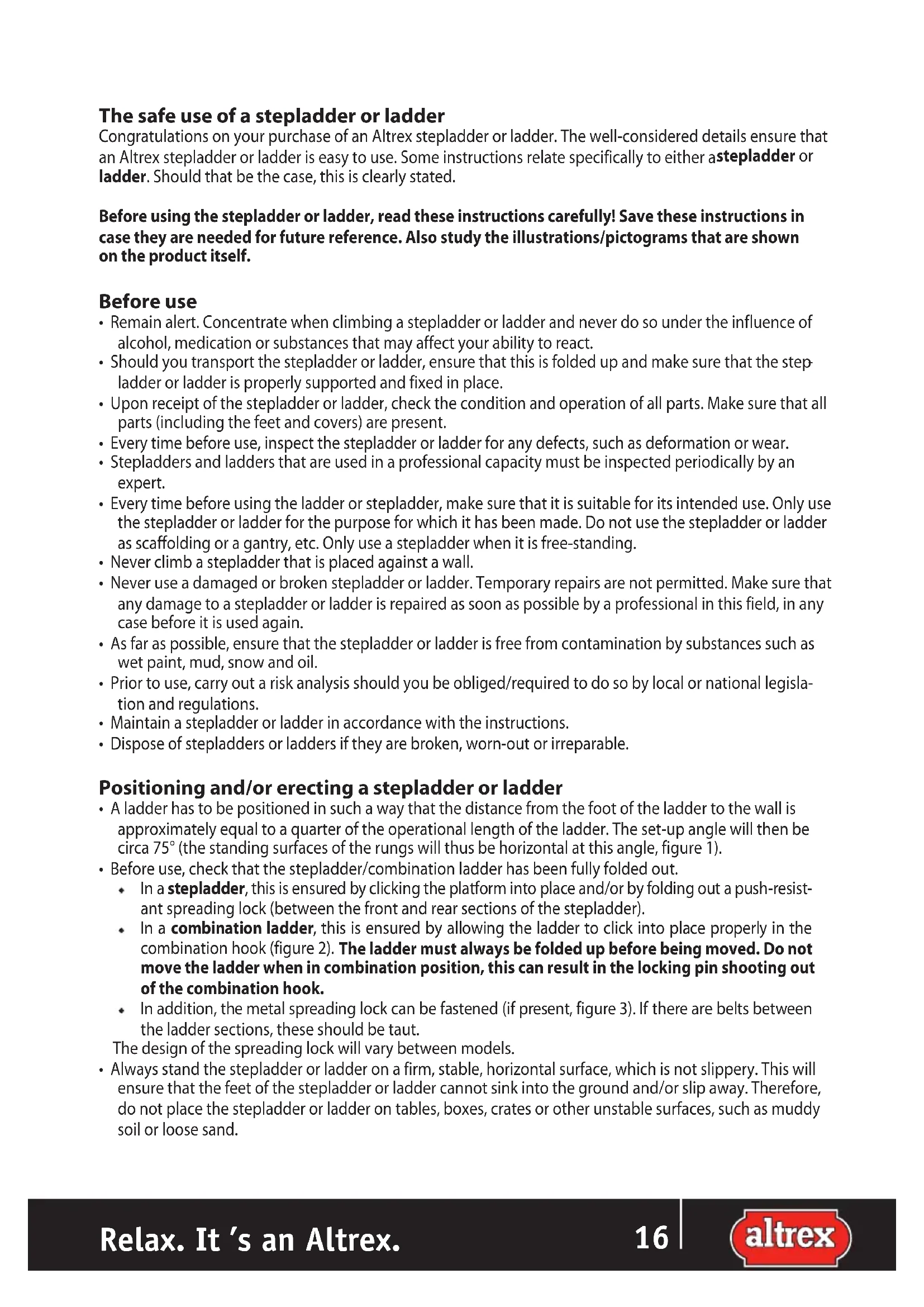 - Always stand the stepladder or ladder on a firm, stable, horizontal surface, which is not slippery. This will ensure that the feet of the stepladder or ladder cannot sink into the ground and/or slip away. Therefore, do not place the stepladder or ladder on tables, boxes, crates or other unstable surfaces, such as muddy soil or loose sand.16 17 Relax. It ’s an Altrex.