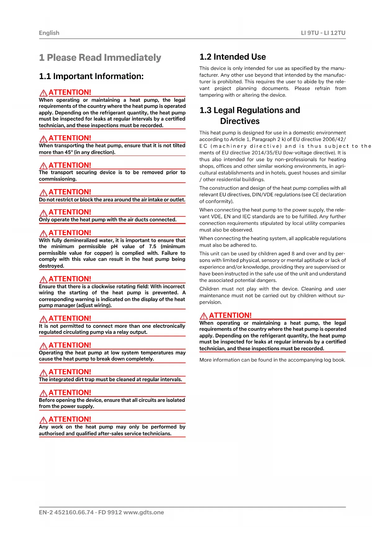 When operating or maintaining a heat pump, the legalrequirements of the country where the heat pump is operatedapply. Depending on the refrigerant quantity, the heat pumpmust be inspected for leaks at regular intervals by a certifiedtechnician, and these inspections must be recorded.More information can be found in the accompanying log book.www.gdts.one 452160.66.74 · FD 9912 EN-3 LI 9TU - LI 12TU English