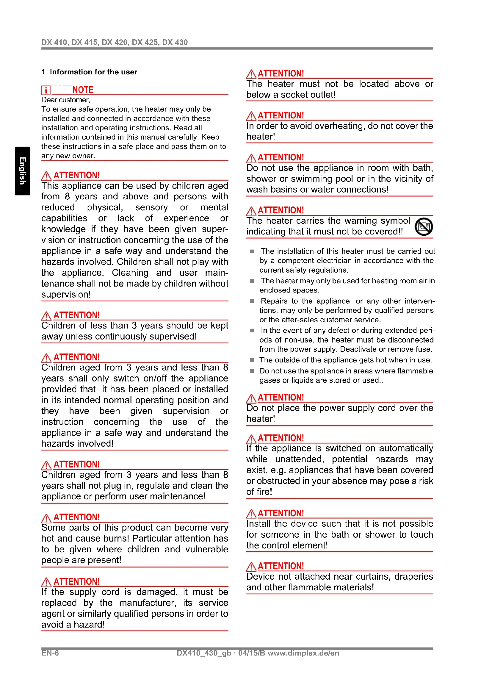 ATTENTION! The original wall mounting bracket supplied, located at the back of the heater, must be used. Remove the bracket from the back of the device by pressing the springs on each side. Drill the fixing holes for the wall mount- ing bracket. Firmly secure bracket to the wall using suitable screws. Insert heater in wall bracket making use of the slots on the back of the heater. Snap heater in place at the top of the wall bracket. 4 Electrical Connection The voltage specified on the type plate must match the local mains voltage. The device plug must always be accessible. The heaters are fitted with a power supply cable with- out plug. The supply cord must be connected to a con- nection box dedicated to the heater. Type Heat out- put (W) Width (mm) Height (mm) Depth (mm) Weight (kg) DX 410 1000 575 350 124 4,1 DX 415 1500 575 350 124 4,1 DX 420 2000 575 350 124 4,1 DX 425 2500 695 350 124 4,8 DX 430 3000 695 350 124 4,8 Type Heat output (W) A (mm) DX 410 1000 354 DX 415 1500 354 DX 420 2000 354 DX 425 2500 476 DX 430 3000 476EN-8 DX410_430_gb · 04/15/B www.dimplex.de/en English DX 410, DX 415, DX 420, DX 425, DX 430 5 Operation The room temperature is regulated using the infinitely adjustable thermostat (C). If the rotary knob is set to the lowest setting i.e. to the extreme left (see figure), the thermostat switches the heating device on at an ambient temperature of approx. 5°C. The heating device is switched on and off using the power switch (D). Two heating levels (I = 1000W or II = 2000W) can be selected using the operating mode switch (E). The red light illuminates when the device is in heating operation. ATTENTION! Depending on the size of the room, heat requirement and thermostat setting, rooms may overheat if the heating is not controlled. This can be dangerous for people who are not able to leave the room as it gets too hot. Glen Dimplex Deutschland GmbH Am Goldenen Feld 18 D-95326 Kulmbach Subject to modifications without prior notice 6 Protection Against Overheating If the permissible temperature is exceeded, the heating device switches off automatically. If this occurs, pull the mains plug out and leave the device unplugged for a few minutes, so that the temperature limiter can switch back again. Then remove the cause e.g. when the air grid is blocked or covered. When the device has cooled suffi- ciently, it can be started up again. 7Faults If the heating device does not give off heat, check the following points: Is the power switch (B) in the ON position? Has the thermostat been set to the desired temper- ature? Has the overheat protection been triggered? See