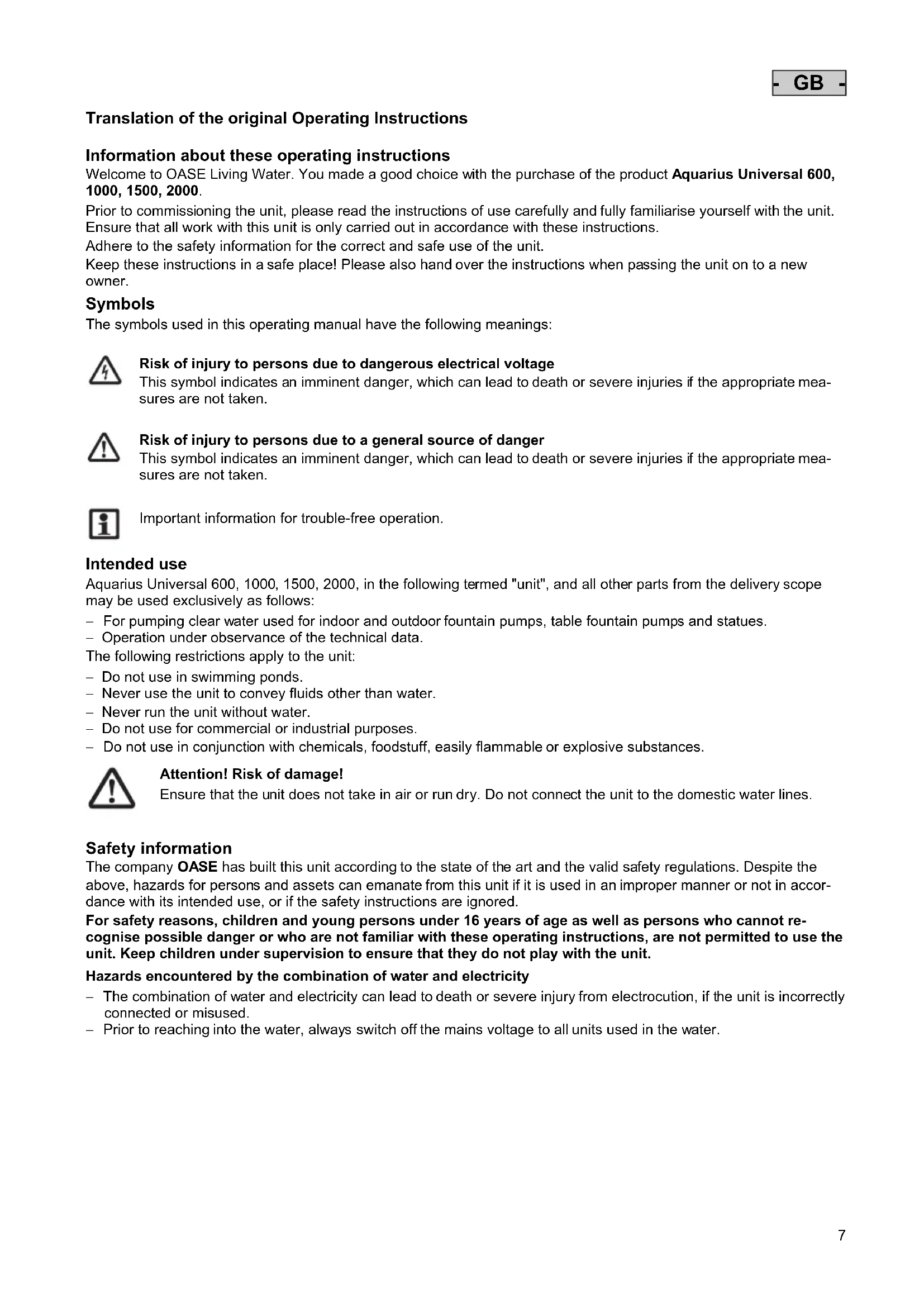 Intended use Aquarius Universal 600, 1000, 1500, 2000, in the following termed "unit", and all other parts from the delivery scope may be used exclusively as follows: − For pumping clear water used for indoor and outdoor fountain pumps, table fountain pumps and statues. − Operation under observance of the technical data. The following restrictions apply to the unit: − Do not use in swimming ponds. − Never use the unit to convey fluids other than water. − Never run the unit without water. − Do not use for commercial or industrial purposes. − Do not use in conjunction with chemicals, foodstuff, easily flammable or explosive substances.