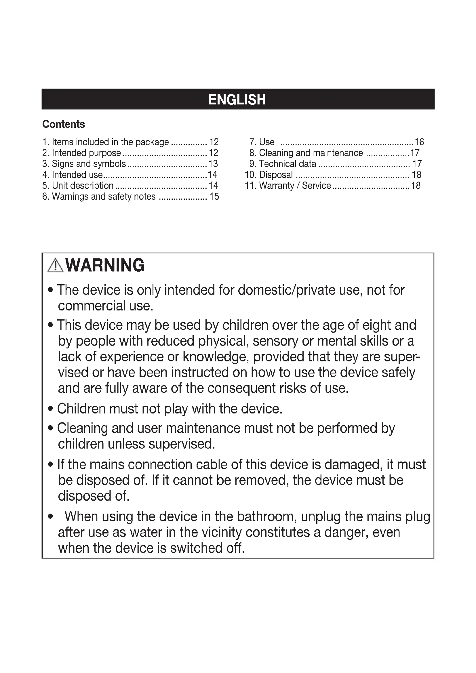 - The device is only intended for domestic/private use, not for commercial use.
