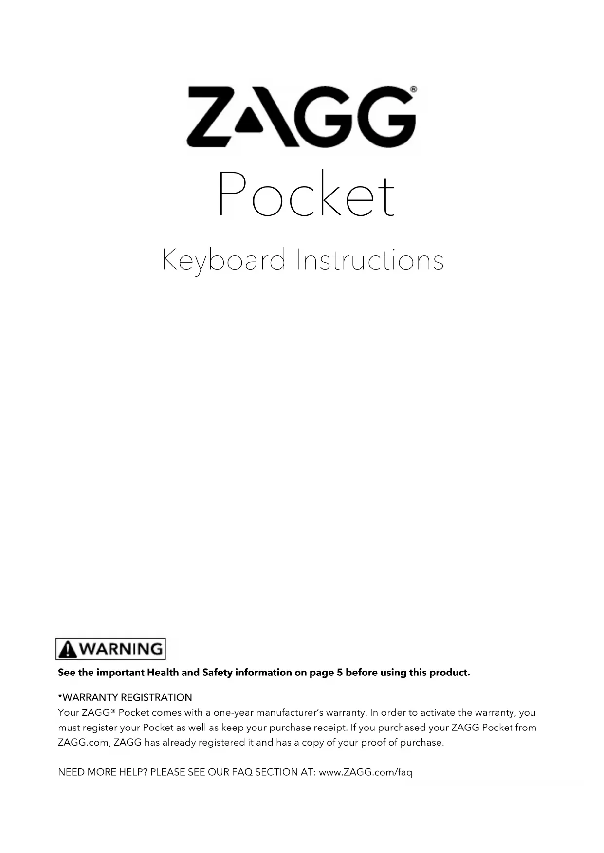 Your ZAGG® Pocket comes with a one-year manufacturer's warranty. In order to activate the warranty, you must register your Pocket as well as keep your purchase receipt. If you purchased your ZAGG Pocket from ZAGG.com, ZAGG has already registered it and has a copy of your proof of purchase.