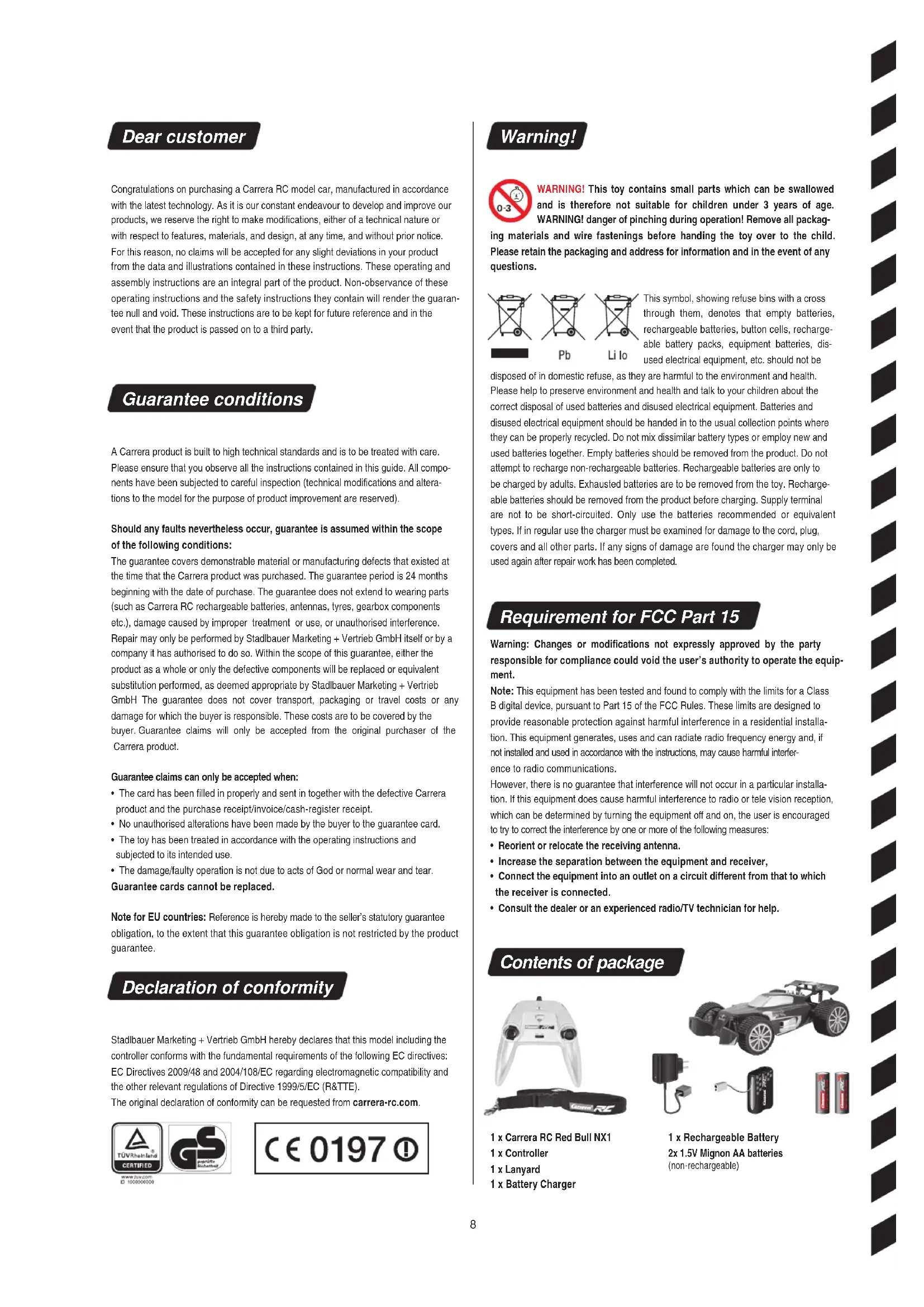 - The damage/faulty operation is not due to acts of God or normal wear and tear. Guarantee cards cannot be replaced. Note for EU countries: Reference is hereby made to the seller’s statutory guarantee obligation, to the extent that this guarantee obligation is not restricted by the product guarantee. Declaration of conformity Stadlbauer Marketing + Vertrieb GmbH hereby declares that this model including the controller conforms with the fundamental requirements of the following EC directives: EC Directives 2009/48 and 2004/108/EC regarding electromagnetic compatibility and the other relevant regulations of Directive 1999/5/EC (R&TTE). The original declaration of conformity can be requested from carrera-rc.com. Warning! WARNING! This toy contains small parts which can be swallowed and is therefore not suitable for children under 3 years of age. WARNING! danger of pinching during operation! Remove all packag- ing materials and wire fastenings before handing the toy over to the child. Please retain the packaging and address for information and in the event of any questions. This symbol, showing refuse bins with a cross through them, denotes that empty batteries, rechargeable batteries, button cells, recharge- able battery packs, equipment batteries, dis- used electrical equipment, etc. should not be disposed of in domestic refuse, as they are harmful to the environment and health. Please help to preserve environment and health and talk to your children about the correct disposal of used batteries and disused electrical equipment. Batteries and disused electrical equipment should be handed in to the usual collection points where they can be properly recycled. Do not mix dissimilar battery types or employ new and used batteries together. Empty batteries should be removed from the product. Do not attempt to recharge non-rechargeable batteries. Rechargeable batteries are only to be charged by adults. Exhausted batteries are to be removed from the toy. Recharge- able batteries should be removed from the product before charging. Supply terminal are not to be short-circuited. Only use the batteries recommended or equivalent types. If in regular use the charger must be examined for damage to the cord, plug, covers and all other parts. If any signs of damage are found the charger may only be used again after repair work has been completed. Requirement for FCC Part 15