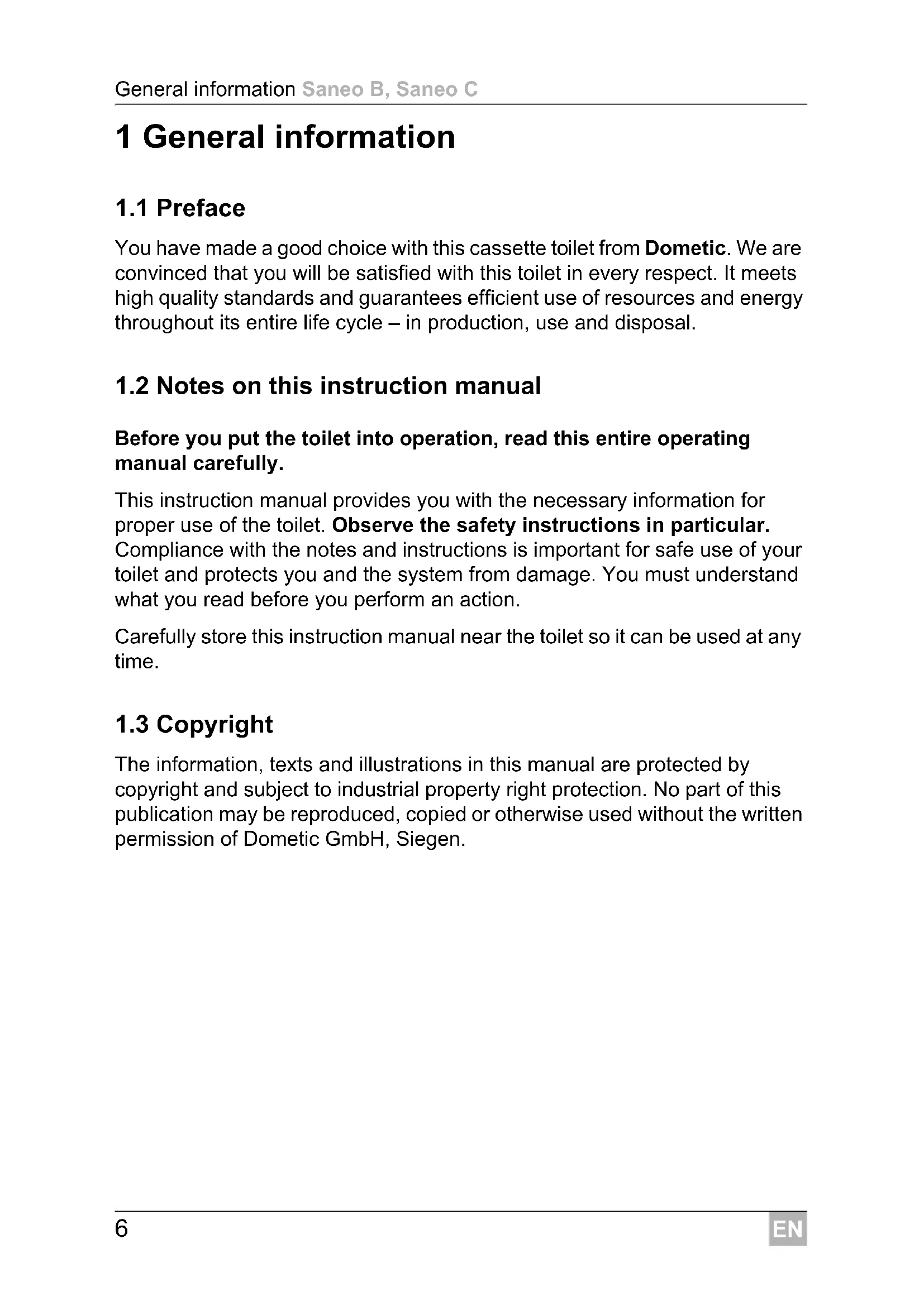The information, texts and illustrations in this manual are protected by copyright and subject to industrial property right protection. No part of this publication may be reproduced, copied or otherwise used without the written permission of Dometic GmbH, Siegen.EN Saneo B, Saneo C General information