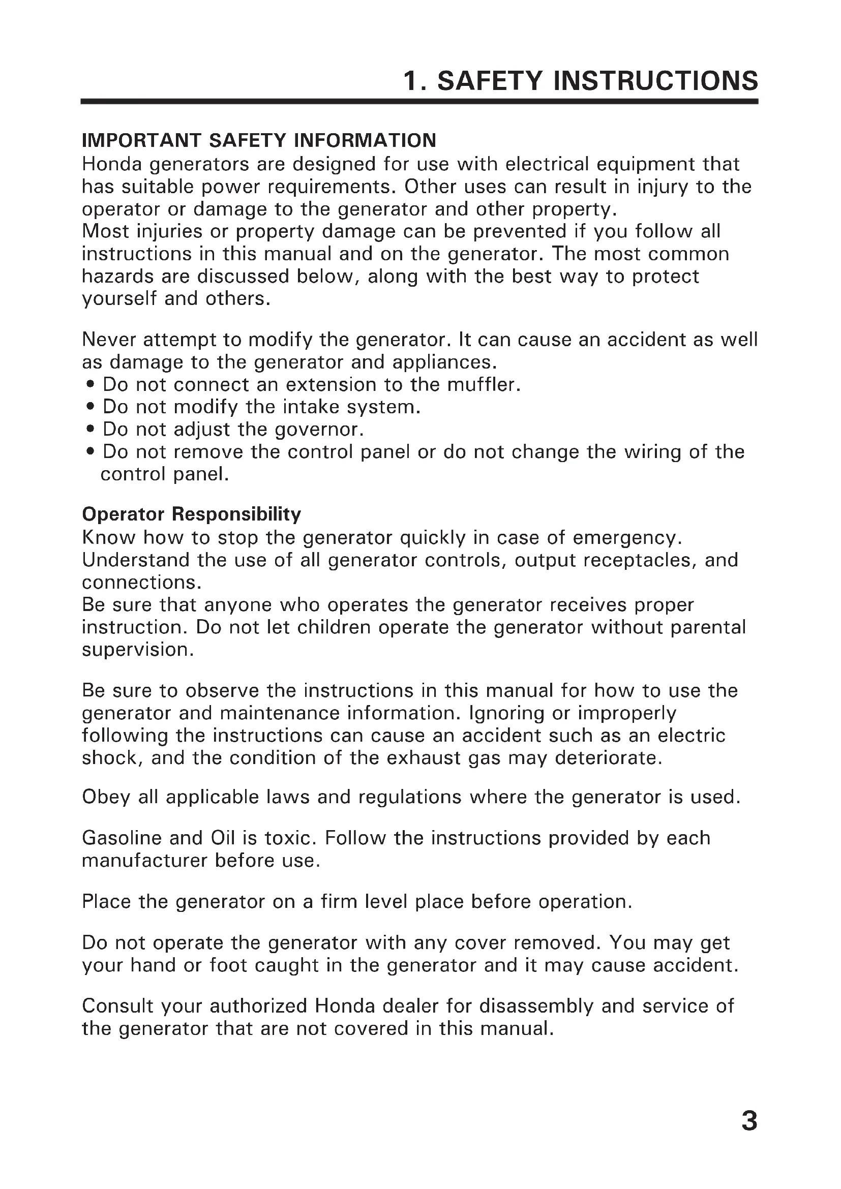 Honda generators are designed for use with electrical equipment that has suitable power requirements. Other uses can result in injury to the operator or damage to the generator and other property. Most injuries or property damage can be prevented if you follow all instructions in this manual and on the generator. The most common hazards are discussed below, along with the best way to protect yourself and others. Never attempt to modify the generator. It can cause an accident as well as damage to the generator and appliances.