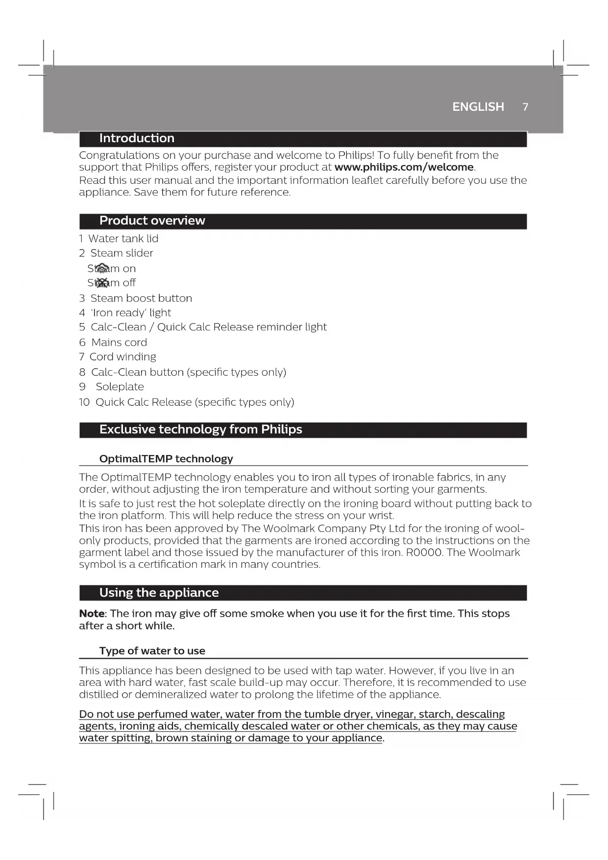 1-4 2-11 2-107 ENGLISH Introduction Congratulations on your purchase and welcome to Philips! To fully benet from the support that Philips oers, register your product at www.philips.com/welcome. Read this user manual and the important information leaet carefully before you use the appliance. Save them for future reference. Product overview 1 Water tank lid 2 Steam slider Steam on Steam o 3 Steam boost button 4 ‘Iron ready’ light 5 Calc-Clean / Quick Calc Release reminder light 6 Mains cord 7 Cord winding 8 Calc-Clean button (specic types only) 9 Soleplate 10 Quick Calc Release (specic types only) Exclusive technology from Philips OptimalTEMP technology The OptimalTEMP technology enables you to iron all types of ironable fabrics, in any order, without adjusting the iron temperature and without sorting your garments. It is safe to just rest the hot soleplate directly on the ironing board without putting back to the iron platform. This will help reduce the stress on your wrist. This iron has been approved by The Woolmark Company Pty Ltd for the ironing of wool- only products, provided that the garments are ironed according to the instructions on the garment label and those issued by the manufacturer of this iron. R0000. The Woolmark symbol is a certication mark in many countries. Using the appliance Note: The iron may give o some smoke when you use it for the rst time. This stops after a short while. Type of water to use This appliance has been designed to be used with tap water. However, if you live in an area with hard water, fast scale build-up may occur. Therefore, it is recommended to use distilled or demineralized water to prolong the lifetime of the appliance. Do not use perfumed water, water from the tumble dryer, vinegar, starch, descaling agents, ironing aids, chemically descaled water or other chemicals, as they may cause water spitting, brown staining or damage to your appliance.ENGLISH