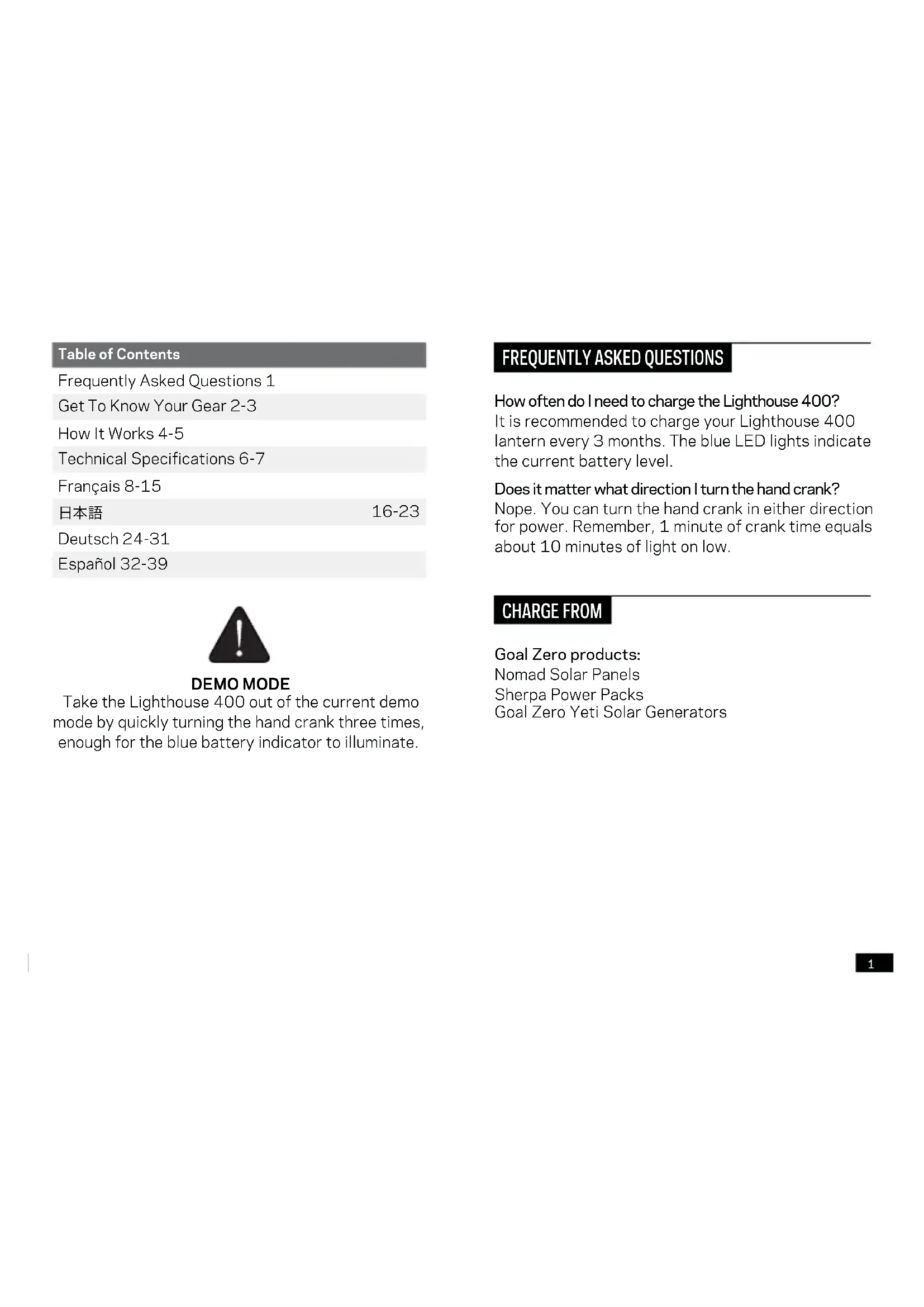 16-23 Deutsch 24-31 Español 32-39 How often do I need to charge the Lighthouse 400? It is recommended to charge your Lighthouse 400 lantern every 3 months. The blue LED lights indicate the current battery level. Does it matter what direction I turn the hand crank? Nope. You can turn the hand crank in either direction for power. Remember, 1 minute of crank time equals about 10 minutes of light on low. Goal Zero products: Nomad Solar Panels Sherpa Power Packs Goal Zero Yeti Solar Generators CHARGE FROM DEMO MODE Take the Lighthouse 400 out of the current demo mode by quickly turning the hand crank three times, enough for the blue battery indicator to illuminate.2 3 HANG IT Put the Lighthouse 400 anywhere with the built-in hanger. CHARGE IT Charge through any USB port, with the dynamo crank, or with Goal Zero solar panels. POWER IT Use the USB port to recharge a phone or boost a tablet. LIGHT IT Multiple brightness and directional lighting options. Red light for emergencies. STAND IT Convenient foldaway legs for easy transport and hassle-free storage.
