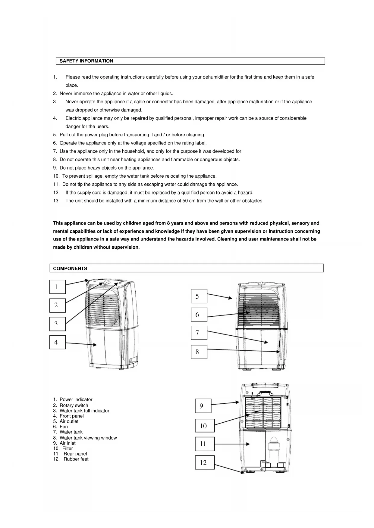 Instruction manual GBSAFETY INFORMATION 1. Please read the operating instructions carefully before using your dehumidifier for the first time and keep them in a safe place.