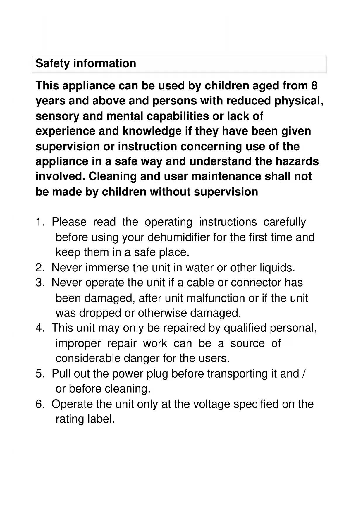 Instruction manual GBSafety information This appliance can be used by children aged from 8 years and above and persons with reduced physical, sensory and mental capabilities or lack of experience and knowledge if they have been given supervision or instruction concerning use of the appliance in a safe way and understand the hazards involved. Cleaning and user maintenance shall not be made by children without supervision.
