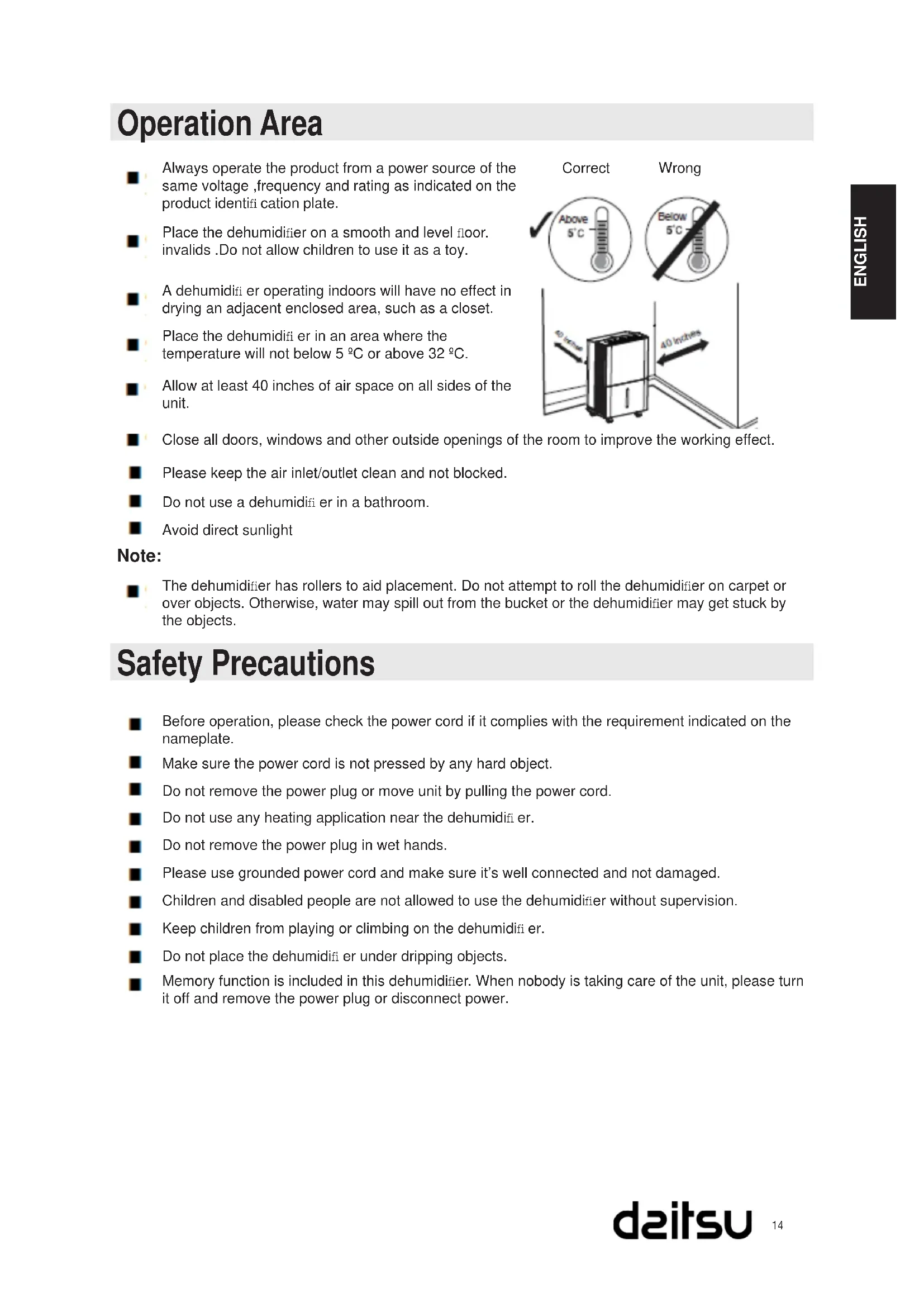 - Moisture removal is best at higher room temperatures. Lower room temperatures will reduce the moisture removal rate. Models are designed to be operated at temperatures above 5°C. Dehumidifi er runs too much Area to be dehumidifi ed is too large.