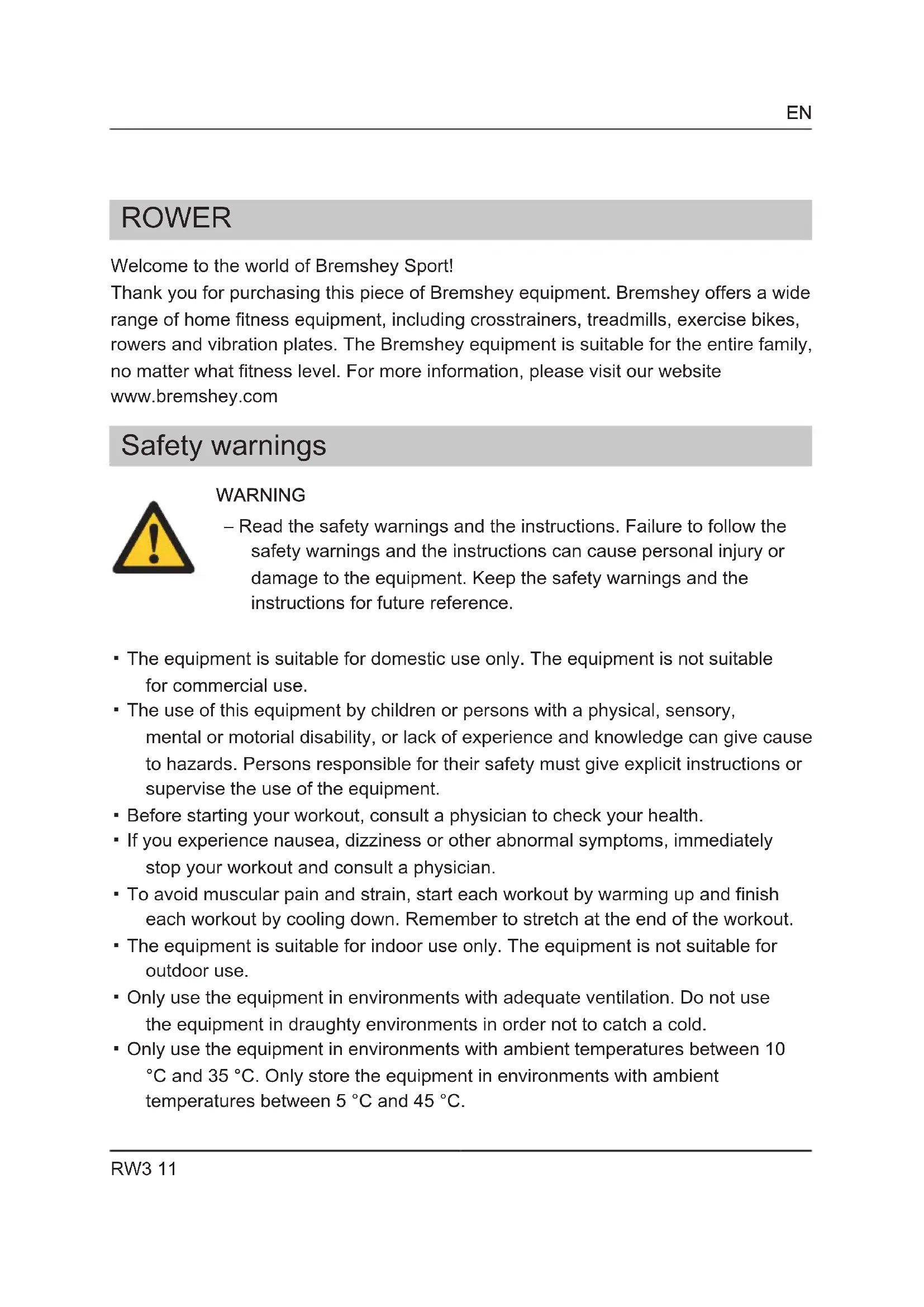 Thank you for purchasing this piece of Bremshey equipment. Bremshey offers a wide range of home fitness equipment, including crosstrainers, treadmills, exercise bikes, rowers and vibration plates. The Bremshey equipment is suitable for the entire family, no matter what fitness level. For more information, please visit our website www.bremshey.com