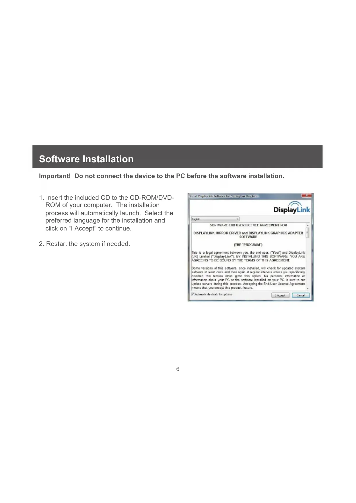 Software Installation Important! Do not connect the device to the PC before the software installation.
