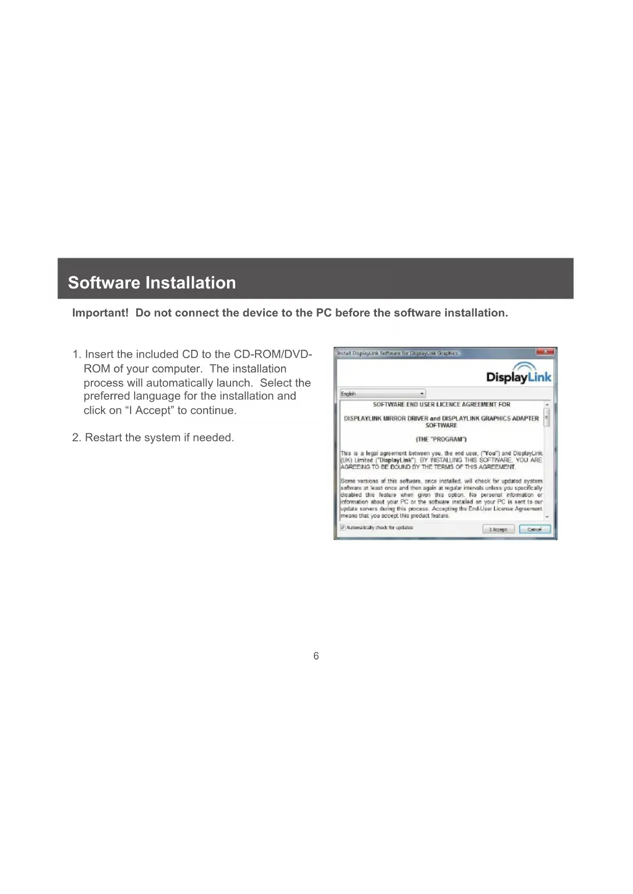 Software Installation Important! Do not connect the device to the PC before the software installation.