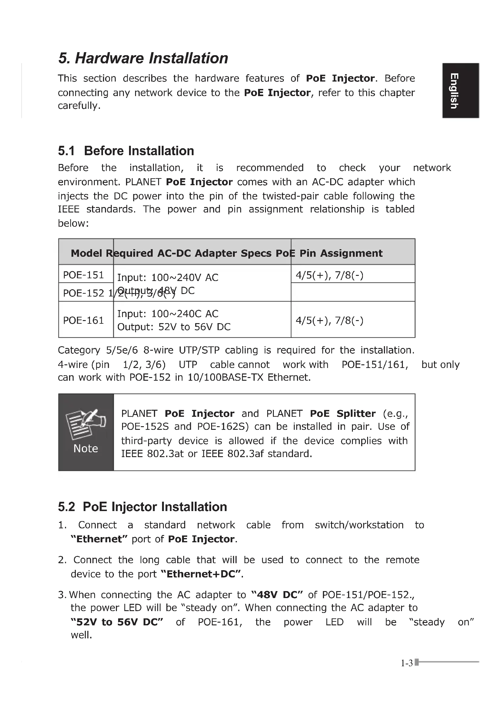 Before the installation, it is recommended to check your network environment. PLANET PoE Injector comes with an AC-DC adapter which injects the DC power into the pin of the twisted-pair cable following the IEEE standards. The power and pin assignment relationship is tabled below: