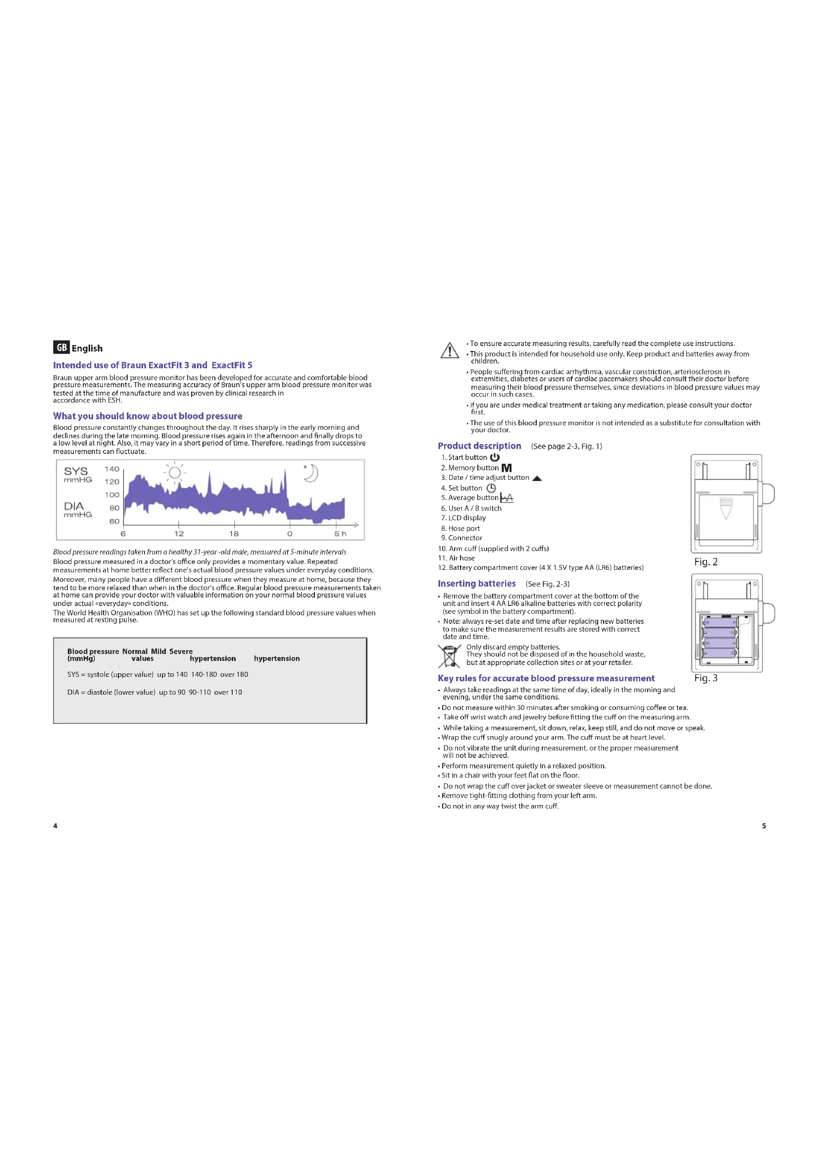 English Intended use of Braun ExactFit 3 and ExactFit 5 Braun upper arm blood pressure monitor has been developed for accurate and comfortable blood pressure measurements. The measuring accuracy of Braun’s upper arm blood pressure monitor was tested at the time of manufacture and was proven by clinical research in accordance with ESH. What you should know about blood pressure Blood pressure constantly changes throughout the day. It rises sharply in the early morning and declines during the late morning. Blood pressure rises again in the afternoon and nally drops to a low level at night. Also, it may vary in a short period of time. Therefore, readings from successive measurements can uctuate. Blood pressure readings taken from a healthy 31-year -old male, measured at 5-minute intervals Blood pressure measured in a doctor’s oce only provides a momentary value. Repeated measurements at home better reect one’s actual blood pressure values under everyday conditions. Moreover, many people have a dierent blood pressure when they measure at home, because they tend to be more relaxed than when in the doctor’s oce. Regular blood pressure measurements taken at home can provide your doctor with valuable information on your normal blood pressure values under actual «everyday» conditions. The World Health Organisation (WHO) has set up the following standard blood pressure values when measured at resting pulse. Blood pressure Normal Mild Severe (mmHg) values hypertension hypertension SYS = systole (upper value) up to 140 140-180 over 180 DIA = diastole (lower value) up to 90 90-110 over 1106