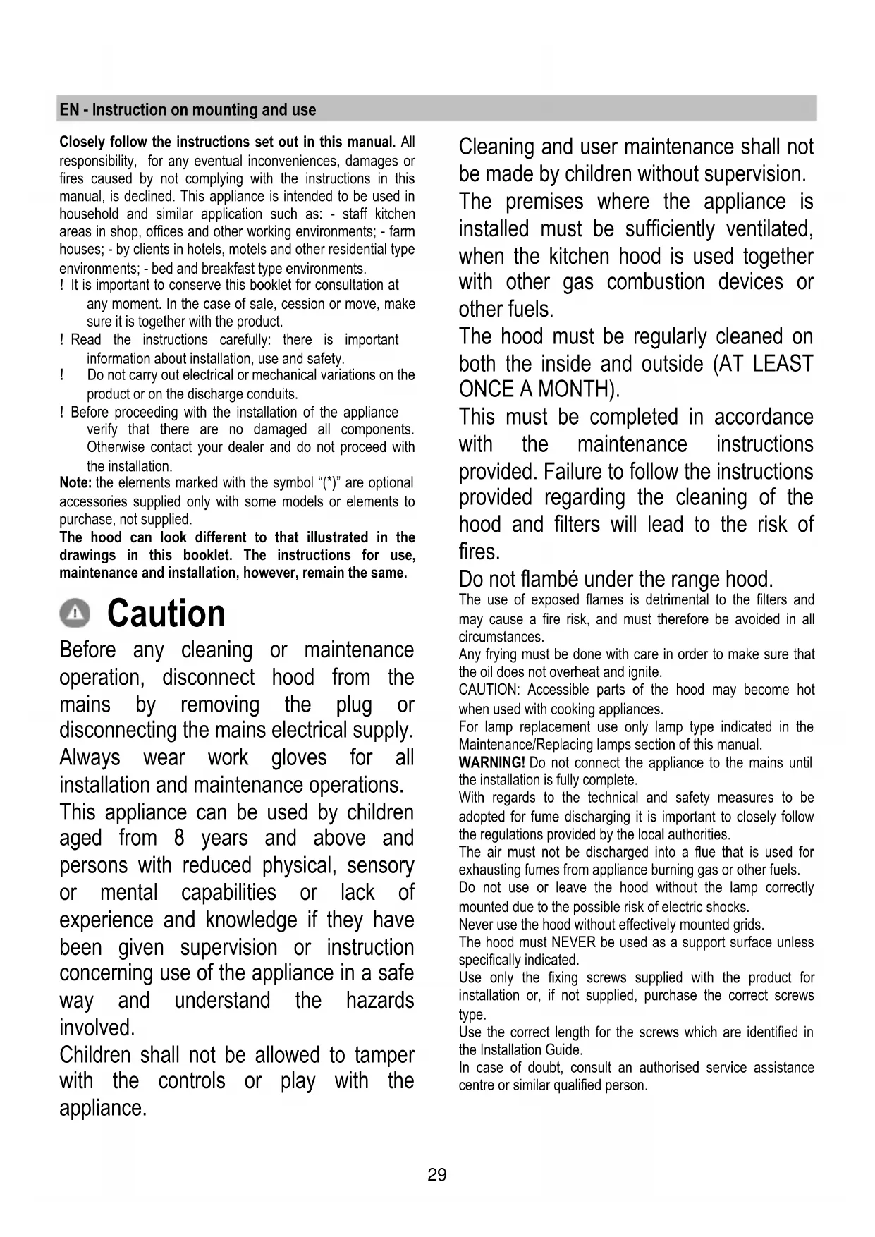 - EMC: EN 55014-1; CISPR 14-1; EN 55014-2; CISPR 14-2; EN/IEC 61000-3-2; EN/IEC 61000-3-3. Suggestions for a correct use in order to reduce the environmental impact: Switch ON the hood at minimum speed when you start cooking and kept it running for few minutes after cooking is finished. Increase the speed only in case of large amount of smoke and vapour and use boost speed(s) only in extreme situations. Replace the charcoal filter(s) when necessary to maintain a good odour reduction efficiency. Clean the grease filter(s) when necessary to maintain a good grease filter efficiency. Use the maximum diameter of the ducting system indicated in this manual to optimize efficiency and minimize noise. Use The hood has been made for use in the internal recirculating filtering version. Cooking fumes and steam are aspirated inside the hood, filtered and cleaned, passing through the fat filter/s and the carbon filter/s that MUST be supplied with the hood. Important It is possible to buy an extraction operation Kit. In this case the charcoal filter must not be installed. Furthermore, the use of the extraction kit may require a different installation of the hood from what shown in this manual; therefore, before starting the installation of the hood, buy the extraction kit and consult the instructions enclosed with the kit. Installation Specialised personnel must carry out both the electrical and the mechanical installation. The minimum distance between the supporting surface for the cooking equipment on the hob and the lowest part of the range hood must be not less than 50cm from electric cookers and 65cm from gas or mixed cookers. If the instructions for installation for the gas hob specify a greater distance, this must be adhered to. Electrical connection The mains tension must correspond to the tension shown on the characteristic label situated inside the hood. The product is meant for connecting directly to the mains supply, therefore apply a regulation bipolar switch that ensures complete disconnection from the mains in the conditions of category III over- tension, conforming to the installation rules. Warning! Detail B (fixing bracket to the ceiling) is equipped with a conductor (yellow-green) that must be connected to the earth of the domestic electrical plant. Fig. 16-17 ATTENTION! Be particularly careful about positioning the excess cable. Failure to observe this indication could cause grave damage to the apparatus and/or an electric shock to the user or the installer. Warining! Changing the interconnection cable must be carried out by the authorised technical assistance service. Mounting Before beginning installation: