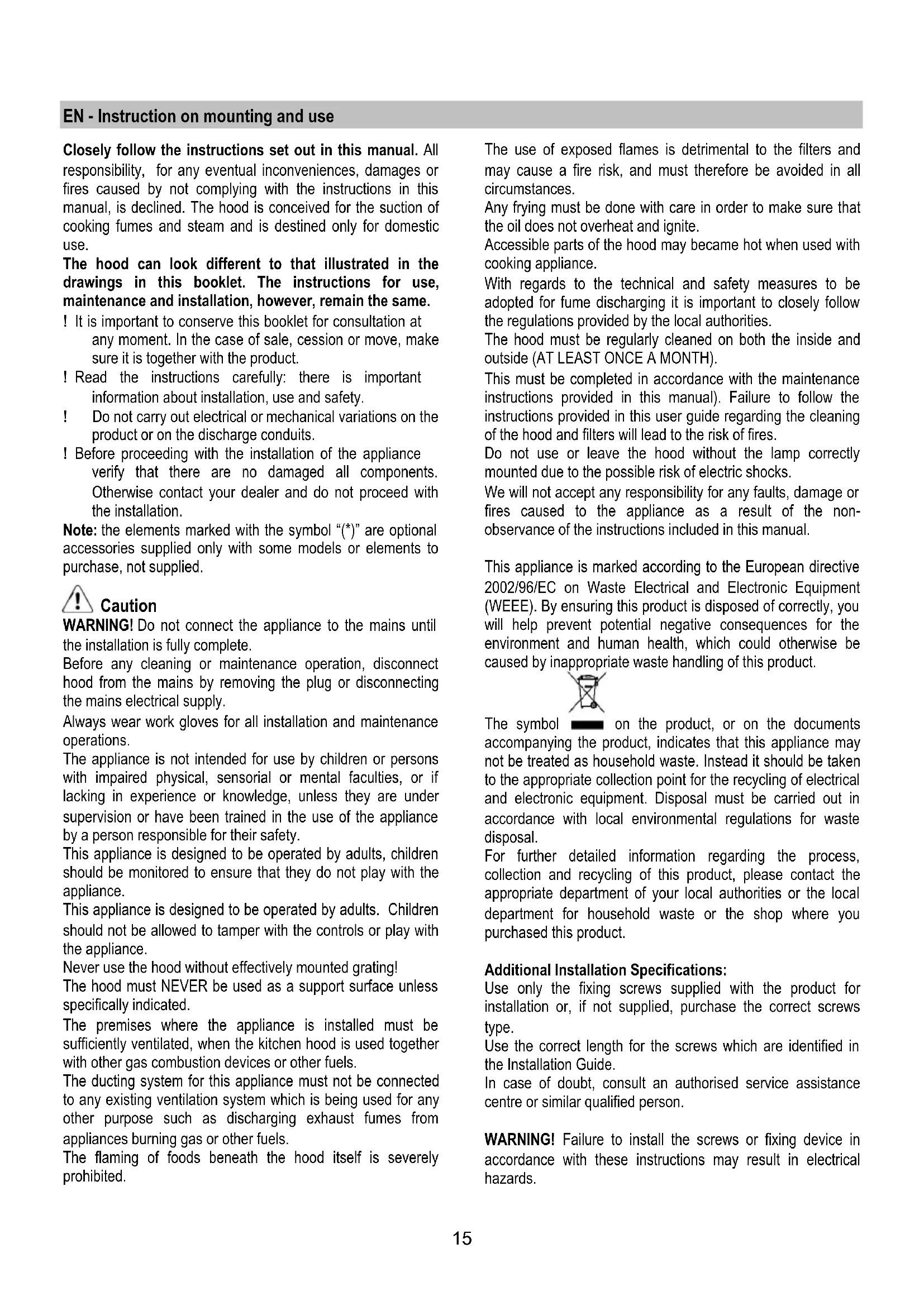 - Filtro ai carboni attivi NON lavabile. Filtro ai carboni attivi lavabile Il filtro al carbone può essere lavato ogni due mesi in acqua calda e detergenti idonei o in lavastoviglie a 65°C (in caso di lavaggio in lavastoviglie eseguire il ciclo di lavaggio completo senza stoviglie all'interno). Togliere l'acqua in eccesso senza rovinare il filtro, dopodiché togliere il materassino posto all'interno del telaio in plastica e riporlo nel forno per 10 minuti a 100°C per asciugarlo definitivamente. Sostituire il materassino ogni 3 anni e ogni volta che il panno risulta danneggiato. Filtro ai carboni attivi NON lavabile La saturazione del filtro carbone si verifica dopo un uso più o meno prolungato a seconda del tipo di cucina e della regolarità della pulizia del filtro grassi. In ogni caso è necessario sostituire la cartuccia al massimo ogni quattro mesi. NON può essere lavato o rigenerato Montaggio Agganciare il filtro ai carboni attivi prima posteriormente sulla linguetta metallica della cappa, poi anteriormente con i due pomelli. Smontaggio Rimuovere il filtro ai carboni attivi girando di 90° i pomelli che lo fissano alla cappa. Sostituzione Lampade La cappa è dotata di un sistema di illuminazione basato sulla tecnologia LED. I LED garantiscono una illuminazione ottimale, una durata fino a 10 volte maggiore delle lampade tradizionali e consentono di risparmiare il 90% di energia elettrica. Per la sostituzione rivolgersi al servizio assistenza tecnica.15 EN - Instruction on mounting and use Closely follow the instructions set out in this manual. All responsibility, for any eventual inconveniences, damages or fires caused by not complying with the instructions in this manual, is declined. The hood is conceived for the suction of cooking fumes and steam and is destined only for domestic use. The hood can look different to that illustrated in the drawings in this booklet. The instructions for use, maintenance and installation, however, remain the same. ! It is important to conserve this booklet for consultation at any moment. In the case of sale, cession or move, make sure it is together with the product. ! Read the instructions carefully: there is important information about installation, use and safety. ! Do not carry out electrical or mechanical variations on the product or on the discharge conduits. ! Before proceeding with the installation of the appliance verify that there are no damaged all components. Otherwise contact your dealer and do not proceed with the installation. Note: the elements marked with the symbol “(*)” are optional accessories supplied only with some models or elements to purchase, not supplied. Caution WARNING! Do not connect the appliance to the mains until the installation is fully complete. Before any cleaning or maintenance operation, disconnect hood from the mains by removing the plug or disconnecting the mains electrical supply. Always wear work gloves for all installation and maintenance operations. The appliance is not intended for use by children or persons with impaired physical, sensorial or mental faculties, or if lacking in experience or knowledge, unless they are under supervision or have been trained in the use of the appliance by a person responsible for their safety. This appliance is designed to be operated by adults, children should be monitored to ensure that they do not play with the appliance. This appliance is designed to be operated by adults. Children should not be allowed to tamper with the controls or play with the appliance. Never use the hood without effectively mounted grating! The hood must NEVER be used as a support surface unless specifically indicated. The premises where the appliance is installed must be sufficiently ventilated, when the kitchen hood is used together with other gas combustion devices or other fuels. The ducting system for this appliance must not be connected to any existing ventilation system which is being used for any other purpose such as discharging exhaust fumes from appliances burning gas or other fuels. The flaming of foods beneath the hood itself is severely prohibited. The use of exposed flames is detrimental to the filters and may cause a fire risk, and must therefore be avoided in all circumstances. Any frying must be done with care in order to make sure that the oil does not overheat and ignite. Accessible parts of the hood may became hot when used with cooking appliance. With regards to the technical and safety measures to be adopted for fume discharging it is important to closely follow the regulations provided by the local authorities. The hood must be regularly cleaned on both the inside and outside (AT LEAST ONCE A MONTH). This must be completed in accordance with the maintenance instructions provided in this manual). Failure to follow the instructions provided in this user guide regarding the cleaning of the hood and filters will lead to the risk of fires. Do not use or leave the hood without the lamp correctly mounted due to the possible risk of electric shocks. We will not accept any responsibility for any faults, damage or fires caused to the appliance as a result of the non- observance of the instructions included in this manual. This appliance is marked according to the European directive 2002/96/EC on Waste Electrical and Electronic Equipment (WEEE). By ensuring this product is disposed of correctly, you will help prevent potential negative consequences for the environment and human health, which could otherwise be caused by inappropriate waste handling of this product. The symbol on the product, or on the documents accompanying the product, indicates that this appliance may not be treated as household waste. Instead it should be taken to the appropriate collection point for the recycling of electrical and electronic equipment. Disposal must be carried out in accordance with local environmental regulations for waste disposal. For further detailed information regarding the process