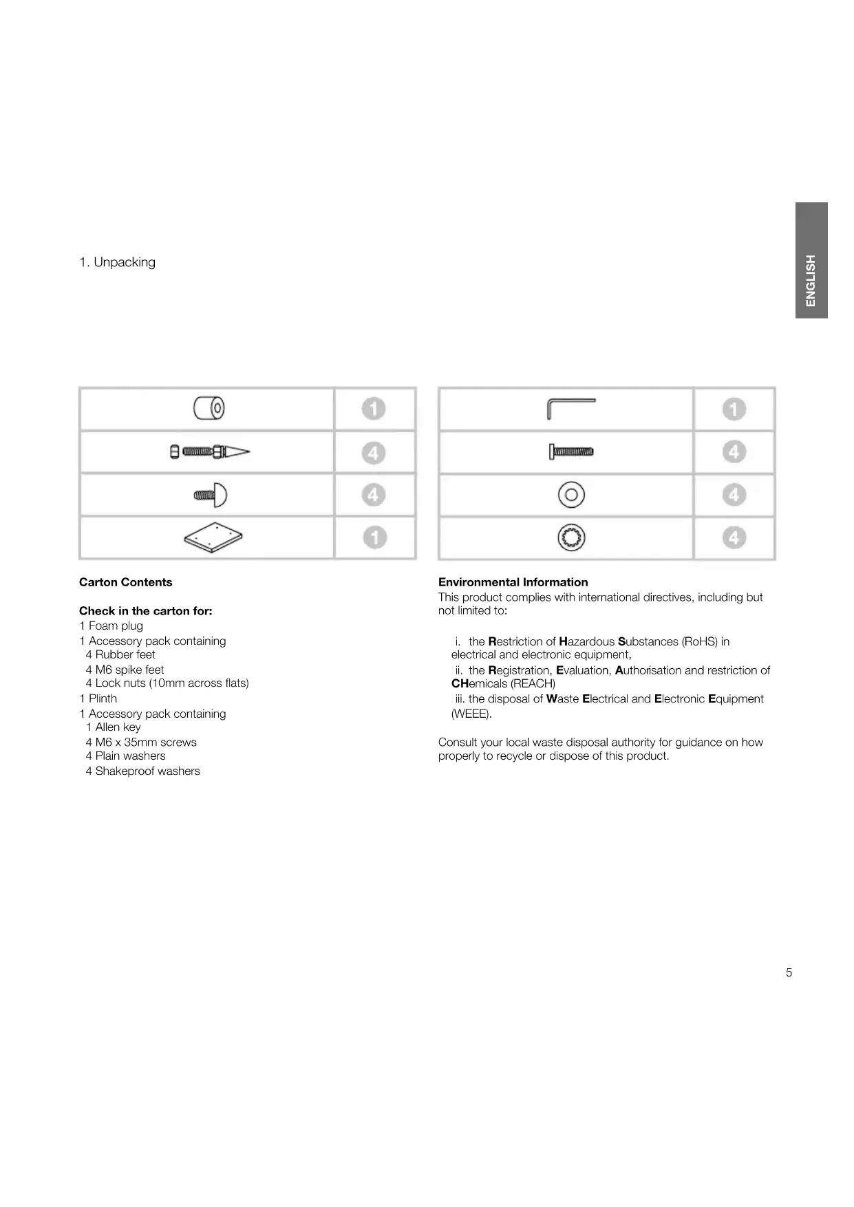Carton Contents Check in the carton for: 1 Foam plug 1 Accessory pack containing 4 Rubber feet 4 M6 spike feet 4 Lock nuts (10mm across ats) 1 Plinth 1 Accessory pack containing 1 Allen key 4 M6 x 35mm screws 4 Plain washers 4 Shakeproof washers Environmental Information This product complies with international directives, including but not limited to: