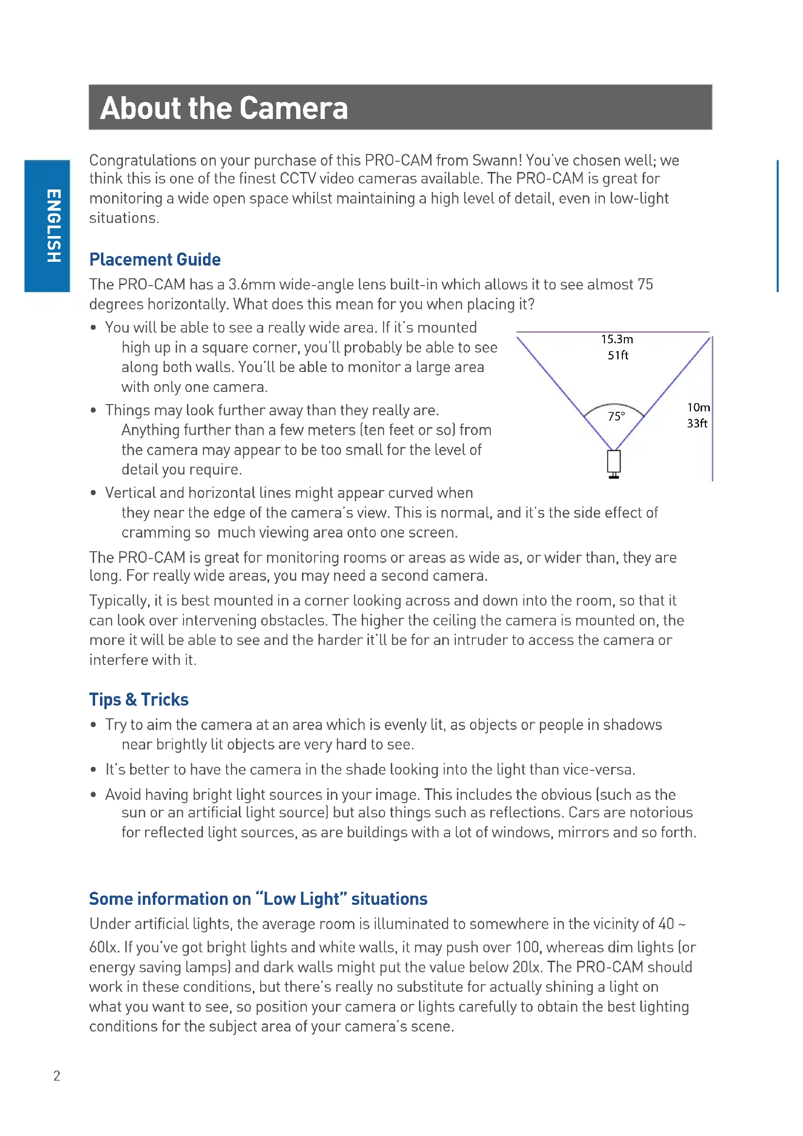 Under artificial lights, the average room is illuminated to somewhere in the vicinity of 40 60lx. If you've got bright lights and white walls, it may push over 100, whereas dim lights (or energy saving lamps) and dark walls might put the value below 20lx. The PRO-CAM should work in these conditions, but there's really no substitute for actually shining a light on what you want to see, so position your camera or lights carefully to obtain the best lighting conditions for the subject area of your camera's scene.