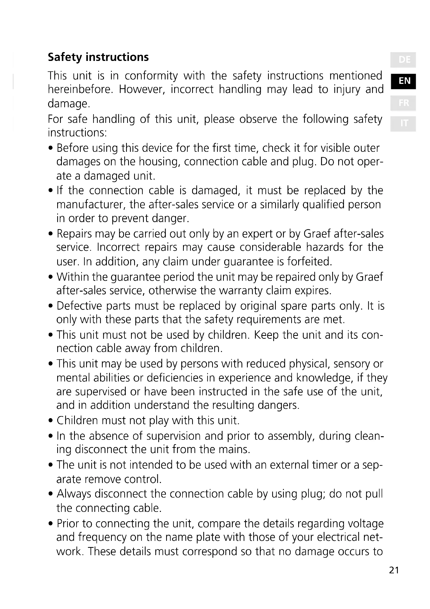 - Repairs may be carried out only by an expert or by Graef after-sales service. Incorrect repairs may cause considerable hazards for the user. In addition, any claim under guarantee is forfeited.