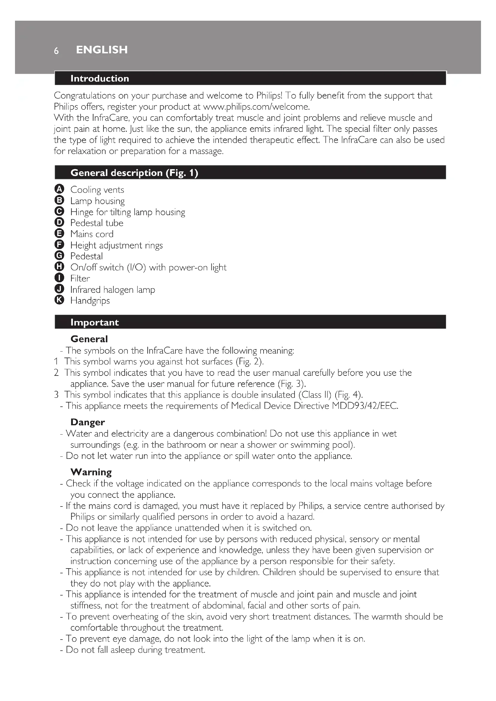 - Check if the voltage indicated on the appliance corresponds to the local mains voltage before you connect the appliance. - If the mains cord is damaged, you must have it replaced by Philips, a service centre authorised by Philips or similarly qualied persons in order to avoid a hazard. - Do not leave the appliance unattended when it is switched on. - This appliance is not intended for use by persons with reduced physical, sensory or mental capabilities, or lack of experience and knowledge, unless they have been given supervision or instruction concerning use of the appliance by a person responsible for their safety. - This appliance is not intended for use by children. Children should be supervised to ensure that they do not play with the appliance. - This appliance is intended for the treatment of muscle and joint pain and muscle and joint stiffness, not for the treatment of abdominal, facial and other sorts of pain. - To prevent overheating of the skin, avoid very short treatment distances. The warmth should be comfortable throughout the treatment. - To prevent eye damage, do not look into the light of the lamp when it is on. - Do not fall asleep during treatment. - Prevent the treatment area from cooling down too fast immediately after treatment. - If there is no improvement after 6-8 treatments, stop using the appliance and consult your doctor. - Contraindications for InfraCare treatment: - Do not use the appliance without consulting your doctor rst if you suffer from severe diseases such as heart disease, acute inammatory diseases, thrombosis, blood coagulation disorders, adrenal suppression, systemic lupus erythematous or malignant diseases. - Do not use the appliance if you are oversensitive to infrared light or if you have oedema. If in doubt, consult your doctor. - Do not use the appliance if you are insensitive to infrared radiation and heat due to a disease (e.g. advanced diabetes) or the use of painkillers. If in doubt, consult your doctor. - Do not use the appliance if you suffer from conditions associated with nerve demyelinisation such as carpal tunnel syndrome, multiple sclerosis and ulnar neuropathy. If in doubt, consult your doctor. - Do not use the appliance if you have an implanted device, particularly not if it is located in the vicinity of the treatment area. If in doubt, consult your doctor. - If you are pregnant, do not use the appliance to treat areas close to your abdomen or your lower back area, to avoid overheating of these areas. If in doubt, consult your doctor. - Do not use the appliance if you have a swelling or an inammation, as heat could aggravate the complaints. If in doubt, consult your doctor. - Do not use the appliance on damaged or irritated skin or on wounds. If in doubt, consult your doctor. - Do not use the appliance to treat areas on which you have recently applied topical counterirritants (creams or ointments containing e.g. menthol), as this can cause a mild inammatory reaction.