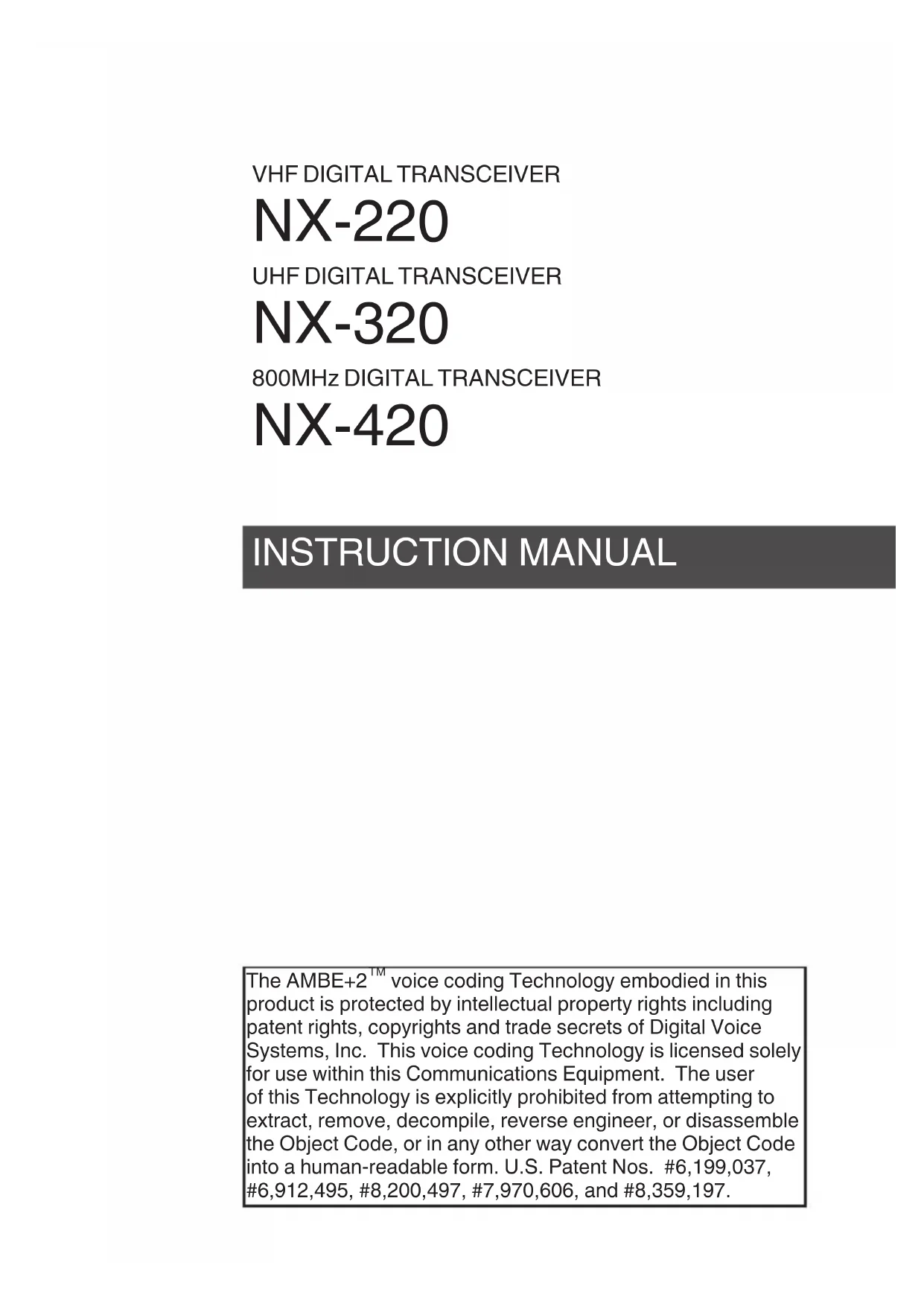 voice coding Technology embodied in this product is protected by intellectual property rights including patent rights, copyrights and trade secrets of Digital Voice Systems, Inc. This voice coding Technology is licensed solely for use within this Communications Equipment. The user of this Technology is explicitly prohibited from attempting to extract, remove, decompile, reverse engineer, or disassemble the Object Code, or in any other way convert the Object Code into a human-readable form. U.S. Patent Nos. #6,199,037, #6,912,495, #8,200,497, #7,970,606, and #8,359,197.THANK YOU We are grateful you have chosen KENWOOD for your land mobile radio applications. This instruction manual covers only the basic operations of your NEXEDGE portable radio. Ask your dealer for information on any customized features they may have added to your radio.