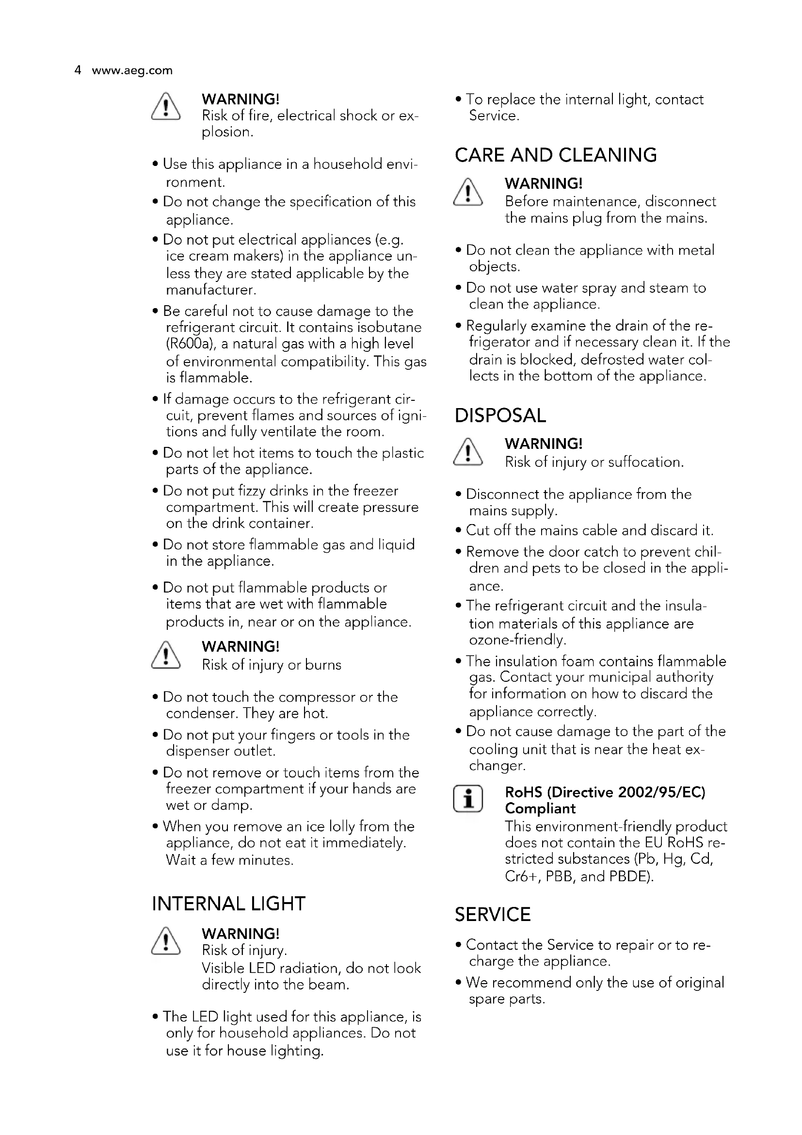 - When you remove an ice lolly from the appliance, do not eat it immediately. Wait a few minutes. INTERNAL LIGHT WARNING! Risk of injury. Visible LED radiation, do not look directly into the beam.
