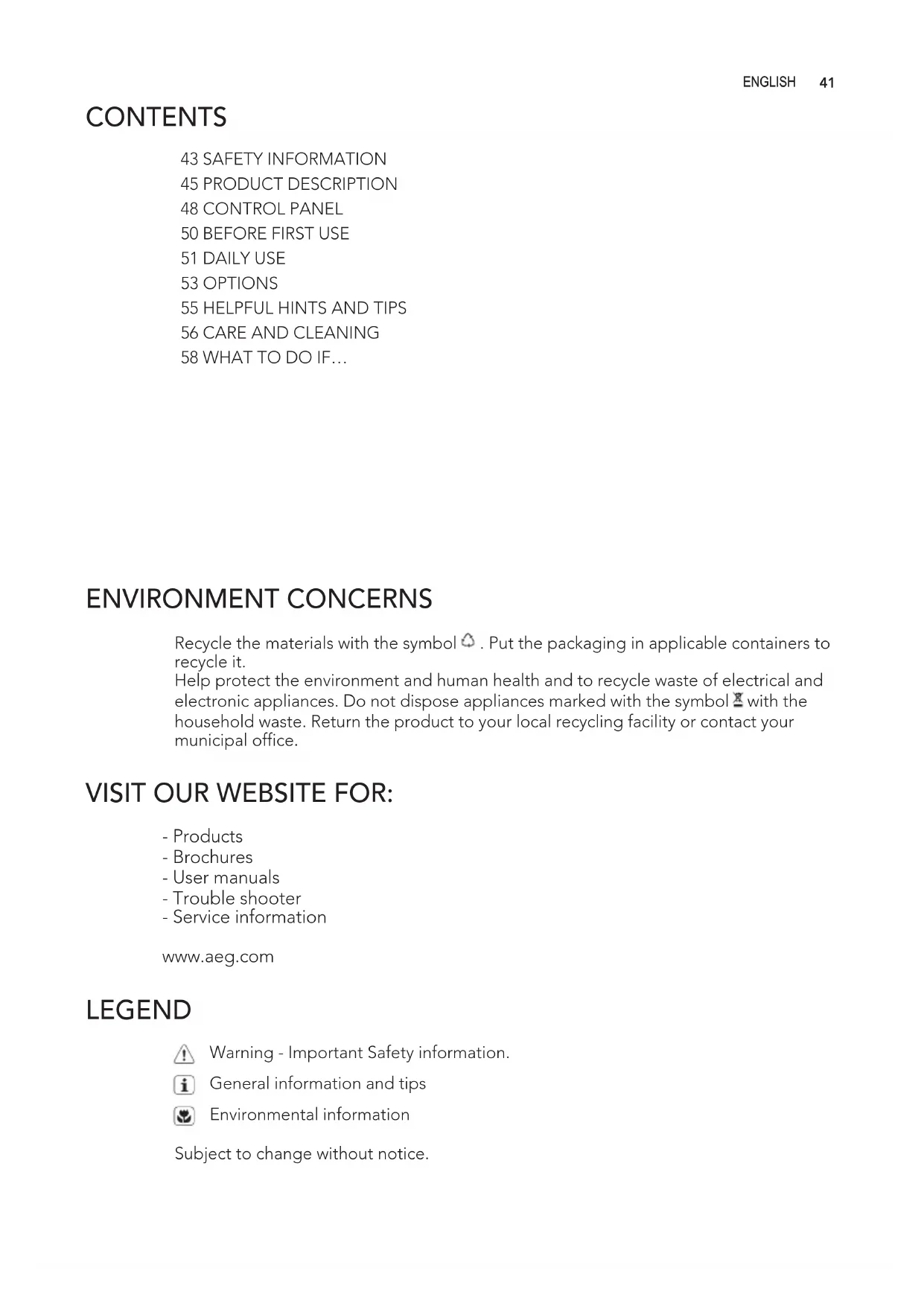 ENVIRONMENT CONCERNS Recycle the materials with the symbol . Put the packaging in applicable containers to recycle it. Help protect the environment and human health and to recycle waste of electrical and electronic appliances. Do not dispose appliances marked with the symbol with the household waste. Return the product to your local recycling facility or contact your municipal office. VISIT OUR WEBSITE FOR: - Products - Brochures - User manuals - Trouble shooter - Service information www.aeg.com LEGEND Warning - Important Safety information. General information and tips Environmental information Subject to change without notice. (1*/,6+