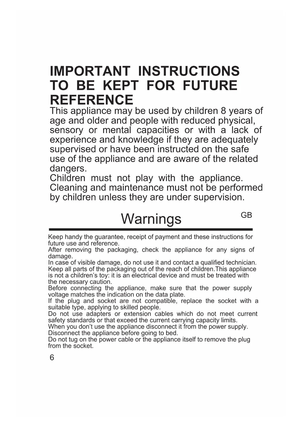 REFERENCE This appliance may be used by children 8 years of age and older and people with reduced physical, sensory or mental capacities or with a lack of experience and knowledge if they are adequately supervised or have been instructed on the safe use of the appliance and are aware of the related dangers. Children must not play with the appliance. Cleaning and maintenance must not be performed by children unless they are under supervision. Warnings Keep handy the guarantee, receipt of payment and these instructions for future use and reference. After removing the packaging, check the appliance for any signs of damage. In case of visible damage, do not use it and contact a qualied technician. Keep all parts of the packaging out of the reach of children.This appliance is not a children’s toy: it is an electrical device and must be treated with the necessary caution. Before connecting the appliance, make sure that the power supply voltage matches the indication on the data plate. If the plug and socket are not compatible, replace the socket with a suitable type, applying to skilled people. Do not use adapters or extension cables which do not meet current safety standards or that exceed the current carrying capacity limits. When you don’t use the appliance disconnect it from the power supply. Disconnect the appliance before going to bed. Do not tug on the power cable or the appliance itself to remove the plug from the socket. GB7 In the event of a breakdown, operating anomaly, tripped fuse or tripped protective thermal fuse, unplug the appliance immediately and contact an authorized service centre; do not attempt to repair the appliance yourself. If the power cable gets damaged, it has to be replaced only in a service centre approved by the manufacturer. The appliance has been designed and manufactured to operate as a heating pad. Any other use is considered inappropriate and therefore dangerous. Use the equipment only with the type of control device indicated on the equipment itself. For the sake of safety, never open the pad or the control: there are no parts inside that require servicing. Do not use it for persons who are helpless, insensitive to heat, or for small children. Prolonged application at high temperature may burn the skin. Do not place the control unit near sources of heat. Do not cover the control unit or place it on top of the appliance while it is in use. Do not use the appliance out of doors. Do not use if damp or wet. Do not allow children to play with the equipment. Children under the age of 3 must not use this equipment due to their inability to react to overheating. The equipment must not be used by children, unless a parent or a su- pervisor has pre-set the control devices or the child has been adequately trained on safe use of the control unit. Prolonged application with the equipment adjusted on high may cause burns on the skin. Do not use on invalids, infants or people sensitive to heat or very vulne- rable people unable to react to overheating. Use the equipment only with the type of control device indicated on the equipment itself. The equipment must not be used by children, unless a parent or a supervisor has pre-set the control devices or the child has been adequately trained on safe use of the control unit.This appliance is not meant for hospital use. READ THIS INSTRUCTIONS CAREFULLY.