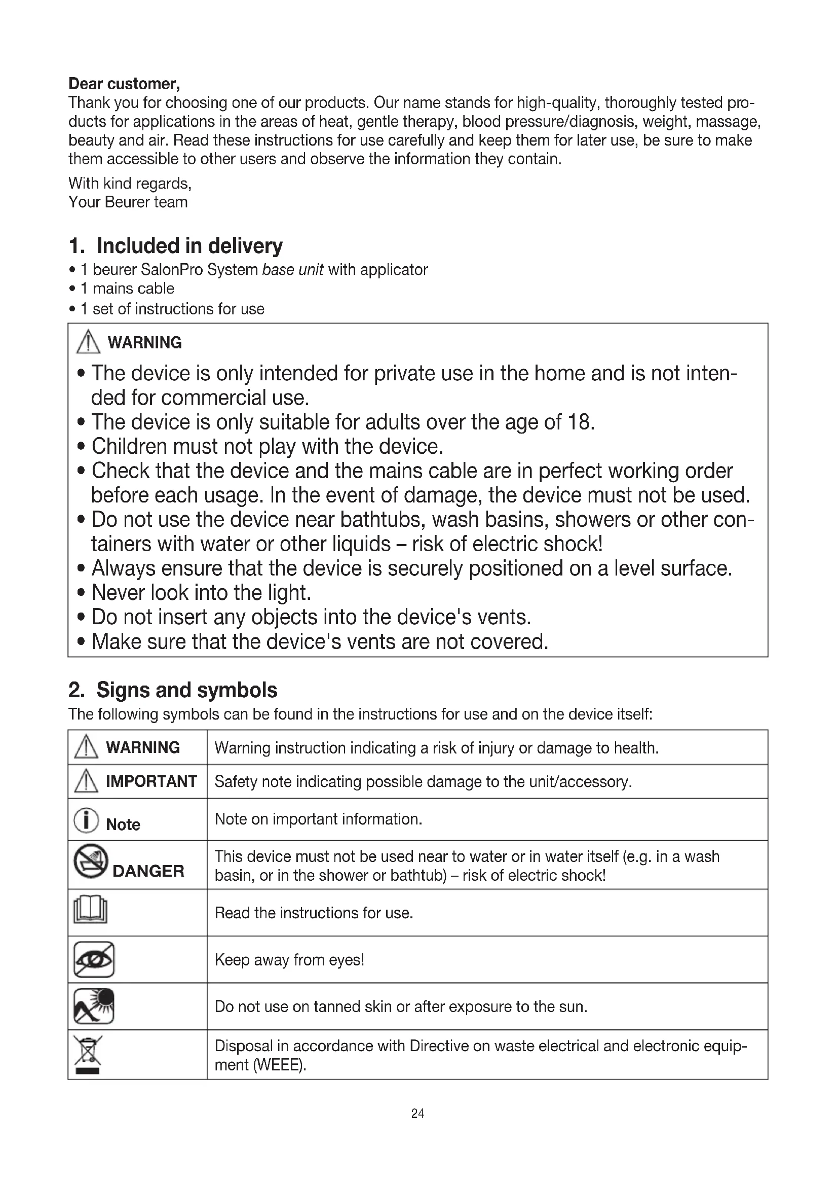 The following symbols can be found in the instructions for use and on the device itself: WARNING Warning instruction indicating a risk of injury or damage to health. IMPORTANT Safety note indicating possible damage to the unit/accessory. Note Note on important information. DANGER This device must not be used near to water or in water itself (e.g. in a wash basin, or in the shower or bathtub) – risk of electric shock! Read the instructions for use. Keep away from eyes! Do not use on tanned skin or after exposure to the sun. Disposal in accordance with Directive on waste electrical and electronic equip- ment (WEEE).25 This product satisfies the requirements of the applicable European and national directives.