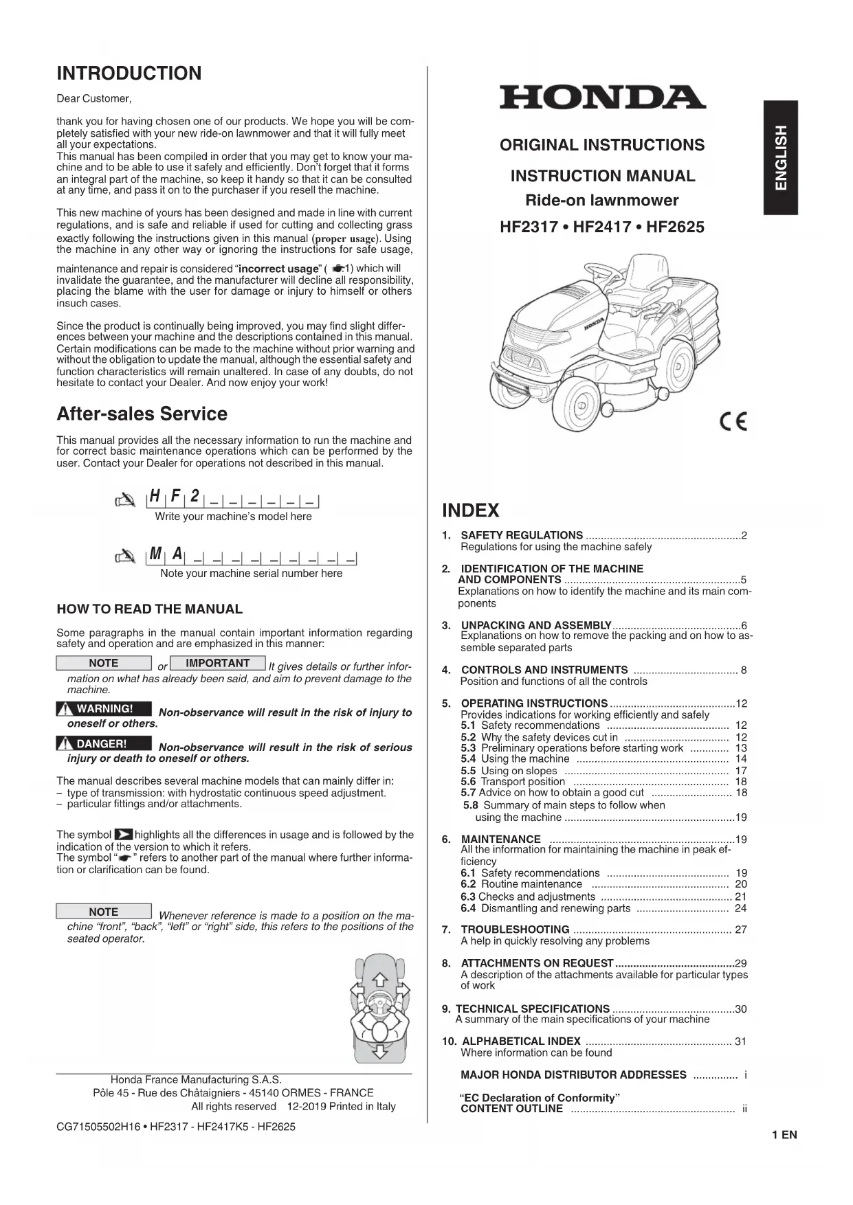 Where information can be found MAJOR HONDA DISTRIBUTOR ADDRESSES ............... i “EC Declaration of Conformity” CONTENT OUTLINE ....................................................... ii 1 EN ORIGINAL INSTRUCTIONS INSTRUCTION MANUAL HF2317 • HF2417 • HF2625 Ride-on lawnmower Honda France Manufacturing S.A.S.Pôle 45 - Rue des Châtaigniers - 45140 ORMES - FRANCEAll rights reservedWrite your machine’s model here H F 2 _ _ _ _ _ _ Note your machine serial number here M A _ _ _ _ _ _ _ _ _ 12-2019 Printed in Italy ENGLISH CG71505502H16 • HF2317 - HF2417K5 - HF2625– Add fuel, using a funnel, only outdoors; do not smoke during this operation and each time fuel is handled; – Top-up with fuel before igniting the engine; never remove the tank cap or add fuel while the engine is running or when it is hot; – If you have spilled some fuel, do not attempt to ignite the engine but move the machine away from the area of spillage and avoid creating any source of ignition until the fuel has evaporated and fuel vapours have dissipated; – Always put the tank and fuel container caps back on and tighten well; – Do not inhale fuel fumes. – Open the fuel tank slowly to allow the pressure inside to decrease gradually. – Never start the machine in the same place in which you relled it with fuel; the engine must be started in an area at least 3 metres from where you refuelled. – If fuel is spilt on clothing, change clothing before starting the en- gine.