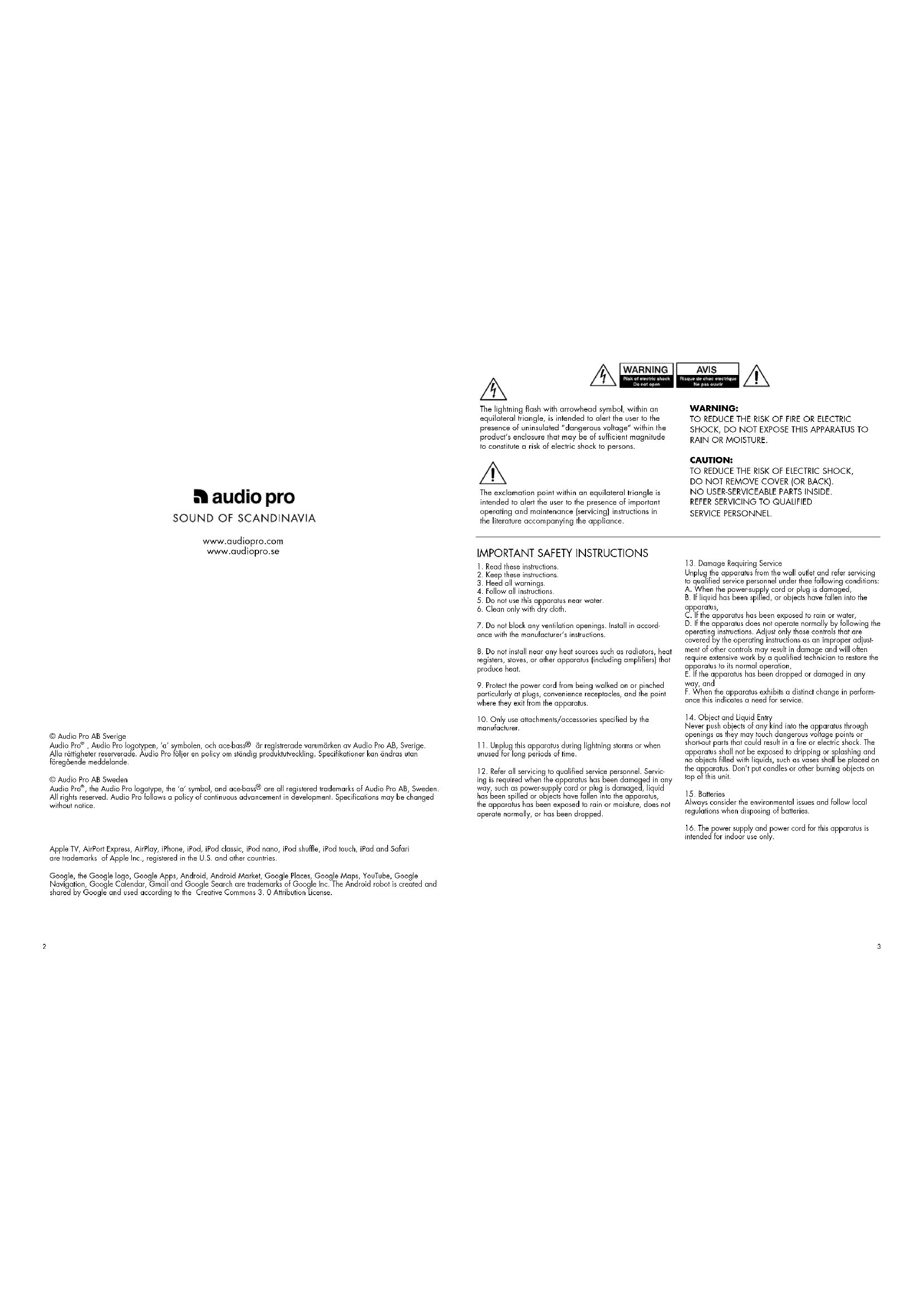 are all registered trademarks of Audio Pro AB, Sweden. All rights reserved. Audio Pro follows a policy of continuous advancement in development. Specifications may be changed without notice. Apple TV, AirPort Express, AirPlay, iPhone, iPod, iPod classic, iPod nano, iPod shuffle, iPod touch, iPad and Safari are trademarks of Apple Inc., registered in the U.S. and other countries. Google, the Google logo, Google Apps, Android, Android Market, Google Places, Google Maps, YouTube, Google Navigation, Google Calendar, Gmail and Google Search are trademarks of Google Inc. The Android robot is created and shared by Google and used according to the Creative Commons 3. 0 Attribution License. www.audiopro.com www.audiopro.se