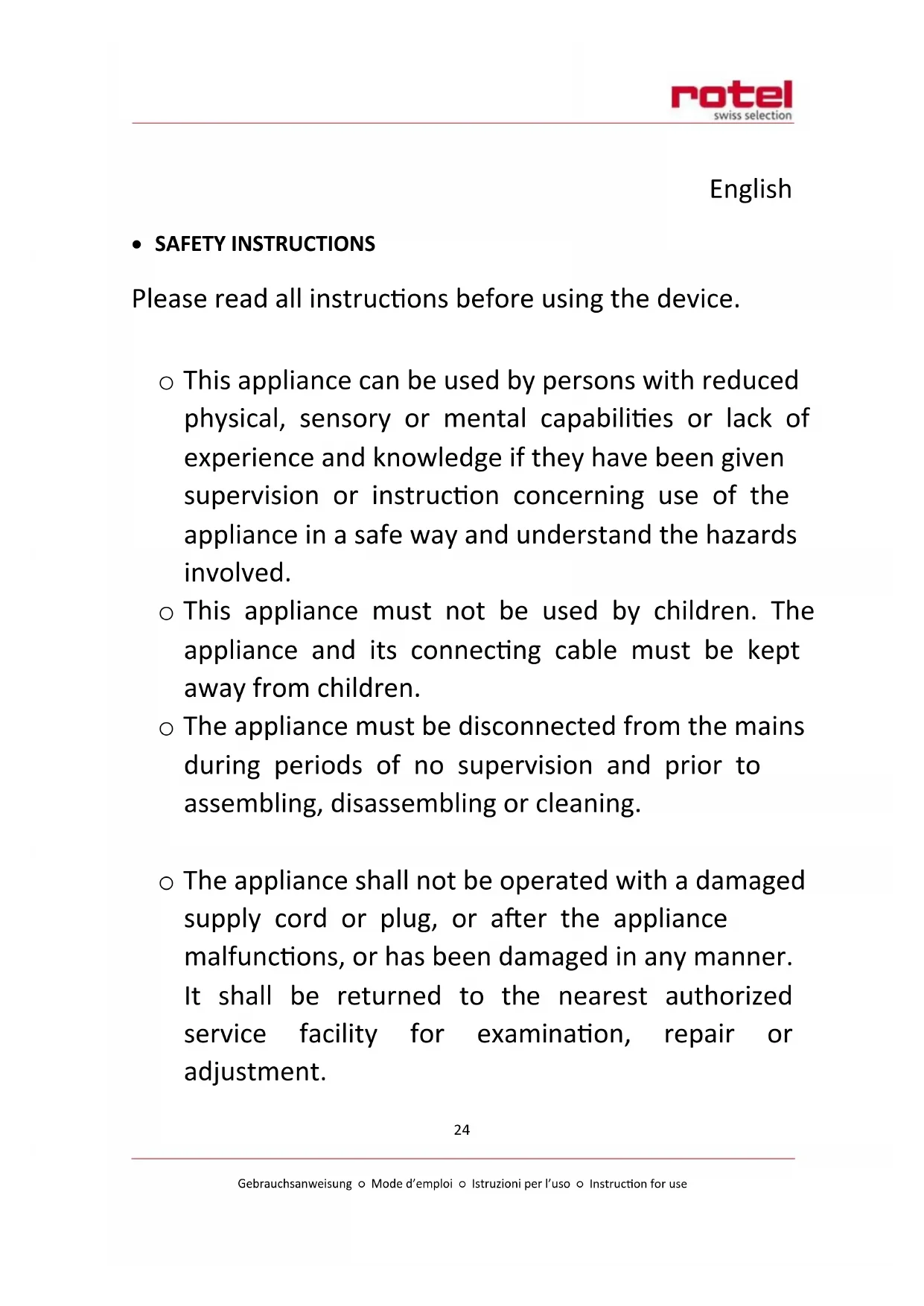 ○ This appliance must not be used by children. The appliance and its connecting cable must be kept away from children.