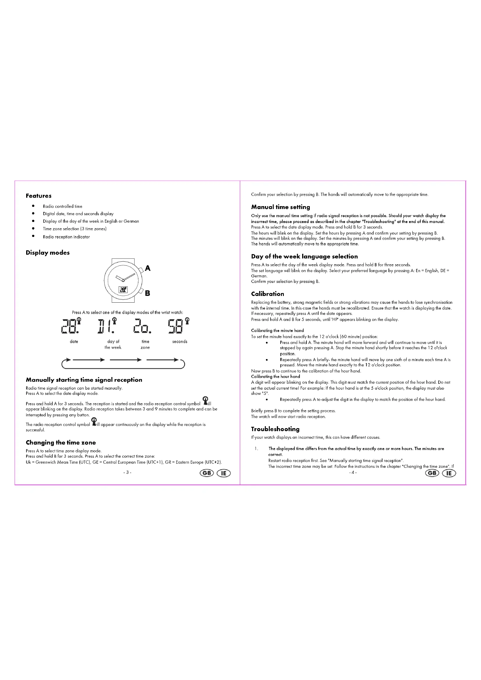 Press A to select one of the display modes of the wrist watch: Manually starting time signal reception Radio time signal reception can be started manually. Press A to select the date display mode. Press and hold A for 3 seconds. The reception is started and the radio reception control symbol will appear blinking on the display. Radio reception takes between 3 and 9 minutes to complete and can be interrupted by pressing any button. The radio reception control symbol will appear continuously on the display while the reception is successful. Changing the time zone Press A to select time zone display mode. Press and hold B for 3 seconds. Press A to select the correct time zone: Uk = Greenwich Mean Time (UTC), GE = Central European Time (UTC+1), GR = Eastern Europe (UTC+2). date day of