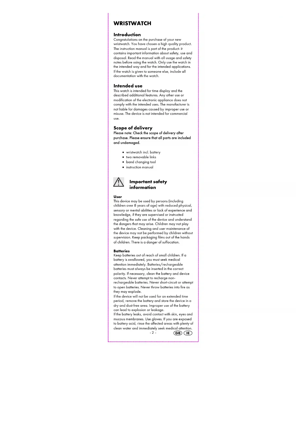 WRISTWATCH Introduction Congratulations on the purchase of your new wristwatch. You have chosen a high quality product. The instruction manual is part of the product- it contains important information about safety, use and disposal. Read the manual with all usage and safety notes before using the watch. Only use the watch in the intended way and for the intended applications. If the watch is given to someone else, include all documentation with the watch. Intended use This watch is intended for time display and the described additional features. Any other use or modification of the electronic appliance does not comply with the intended uses. The manufacturer is not liable for damages caused by improper use or misuse. The device is not intended for commercial use. Scope of delivery Please note: Check the scope of delivery after purchase. Please ensure that all parts are included and undamaged.