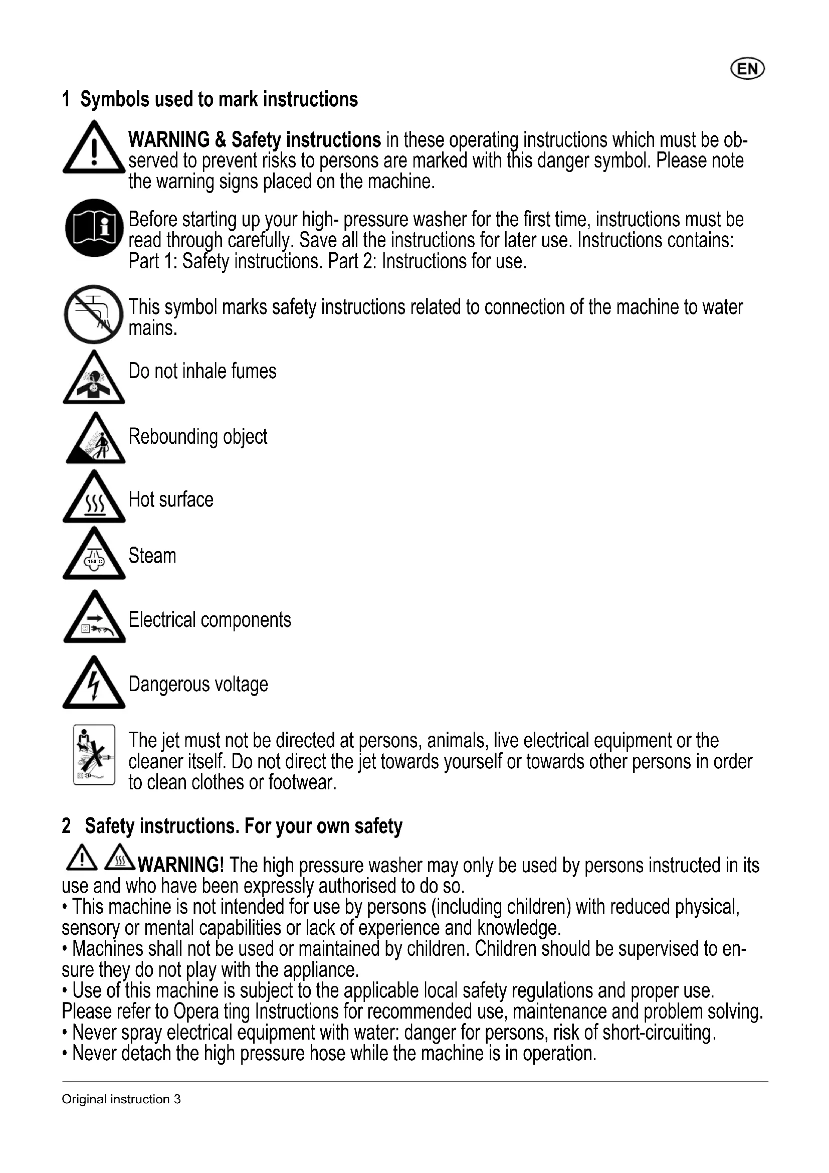 This symbol marks safety instructions related to connection of the machine to water mains. Do not inhale fumes Rebounding object Hot surface Steam Electrical components Dangerous voltage The jet must not be directed at persons, animals, live electrical equipment or the cleaner itself. Do not direct the jet towards yourself or towards other persons in order to clean clothes or footwear. 2 Safety instructions. For your own safety WARNING! The high pressure washer may only be used by persons instructed in its use and who have been expressly authorised to do so.